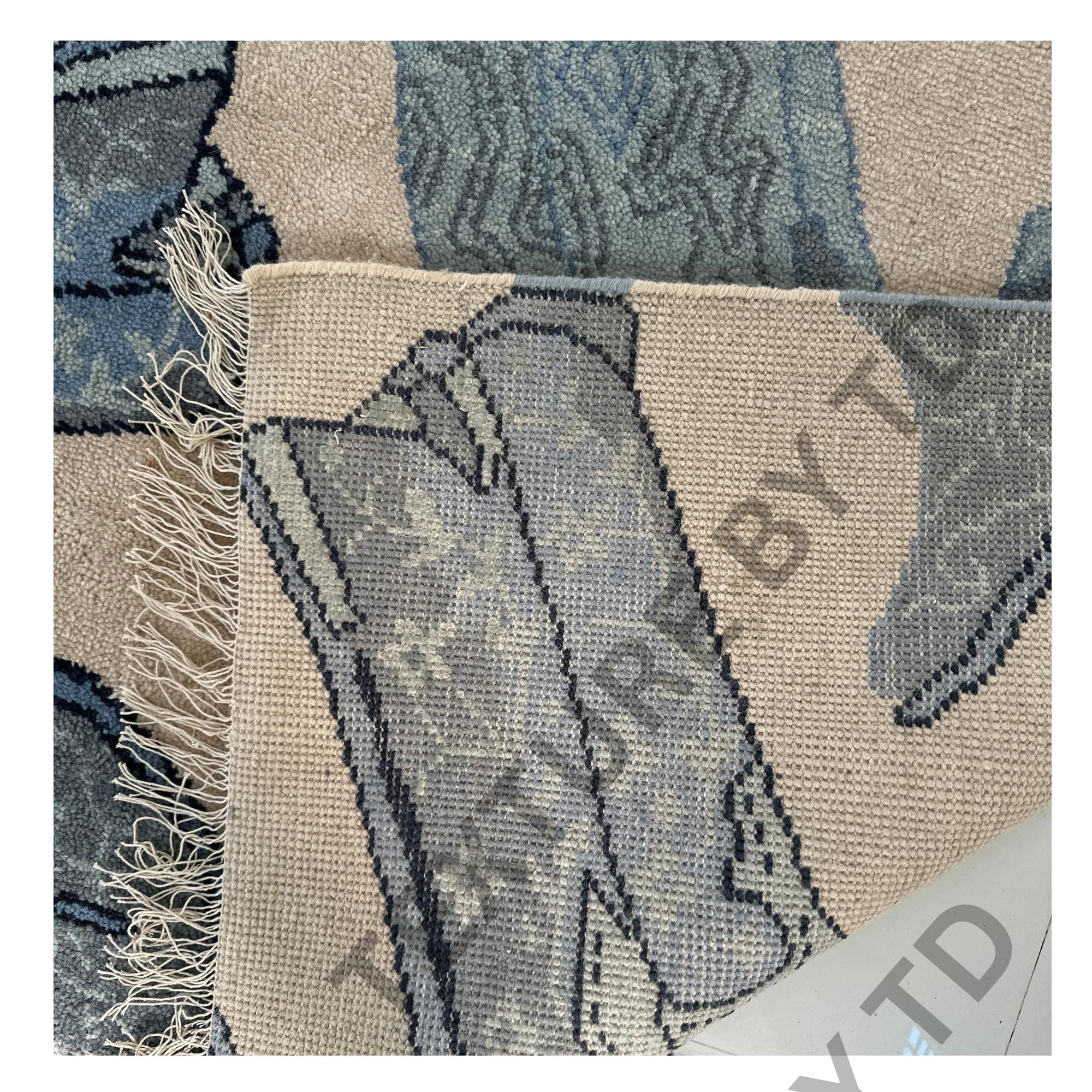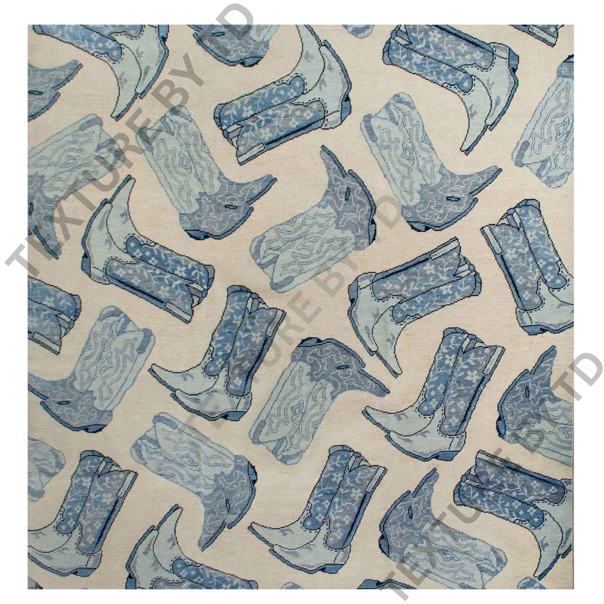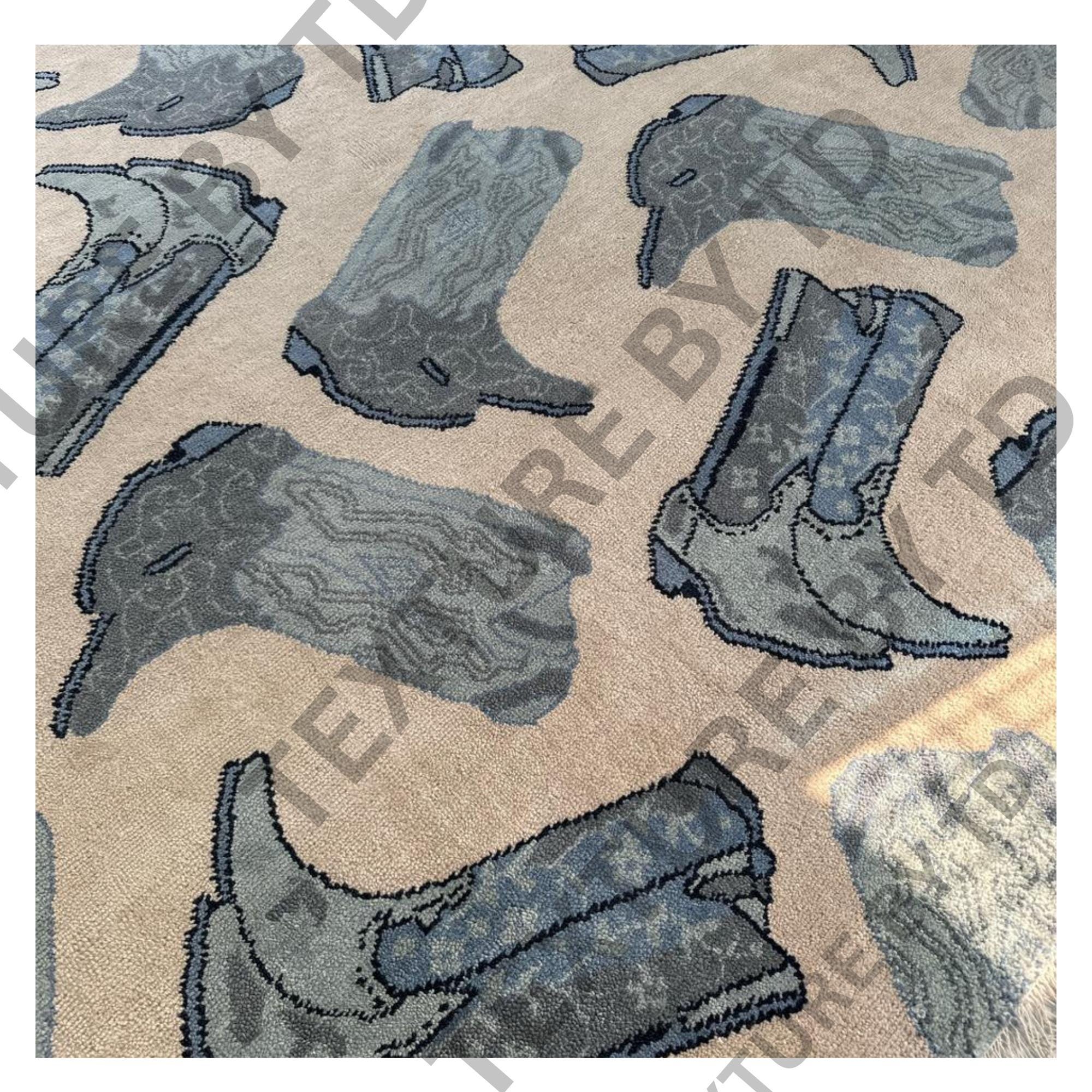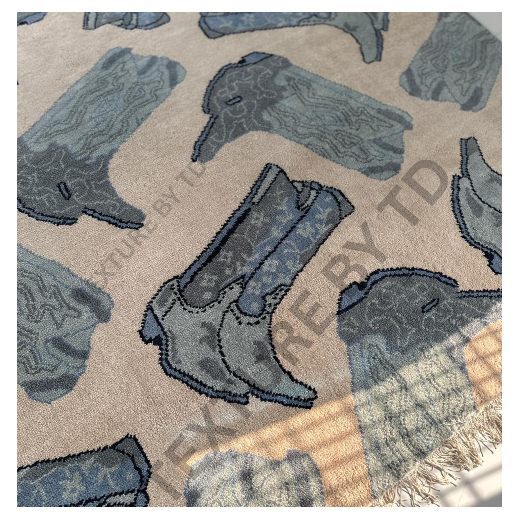 Make a bold style statement with this unique handcrafted rug, featuring an eye-catching repeating boots motif in calming shades of grey, blue, and neutral beige. Designed for modern interiors, this rug blends art, fashion, and craftsmanship into one standout floor piece.