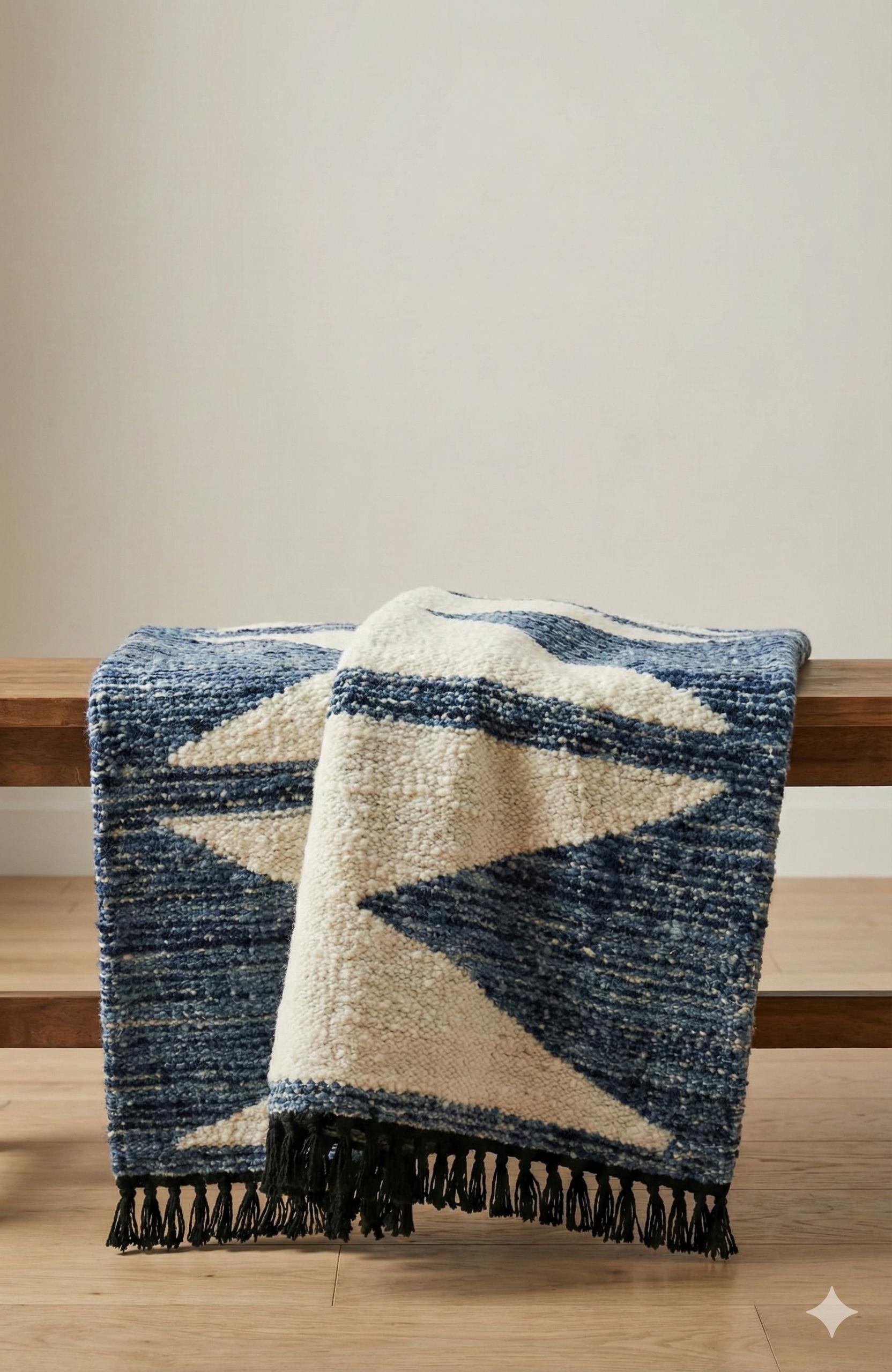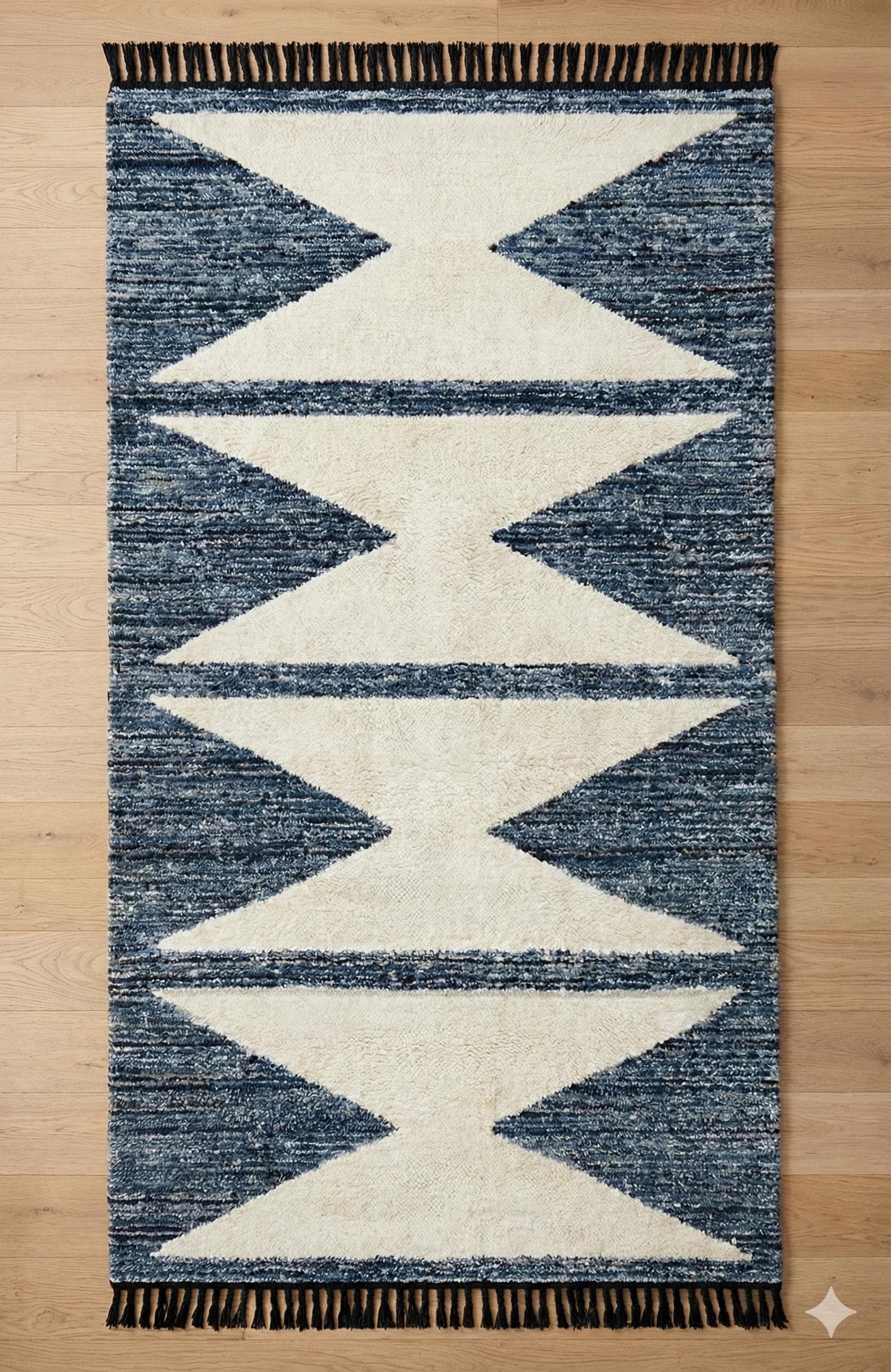 Beautiful hand-Tufted rug featuring a rich Denim background accented detailing. The design has an abstract crosshatch / woven-look pattern, giving the rug depth, texture, and a timeless appeal.