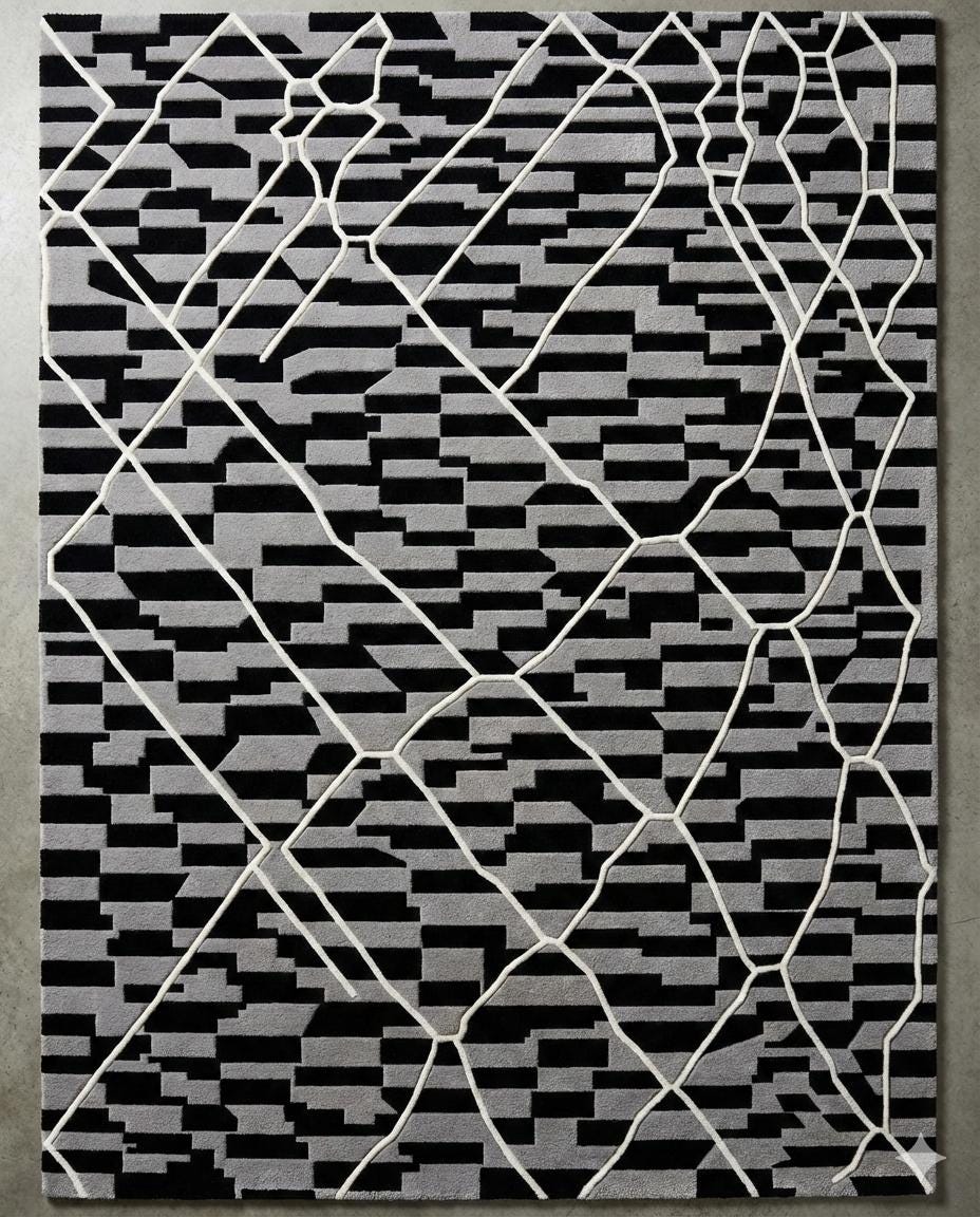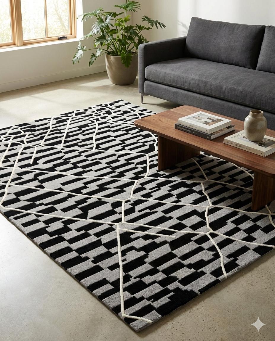 Beautiful hand-Tufted rug featuring a rich Black background accented detailing. The design has an abstract crosshatch / woven-look pattern, giving the rug depth, texture, and a timeless appeal.