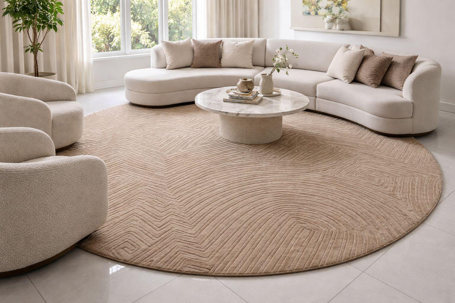 Elevate your living space with the sophisticated artistry of our Hand-Tufted Geometric Maze Rug. This stunning circular piece features a captivating, labyrinth-inspired pattern meticulously carved into a plush wool blend. The tonal beige and sandy hues provide a neutral yet striking aesthetic, making it a versatile centerpiece for modern, minimalist, or transitional interiors.