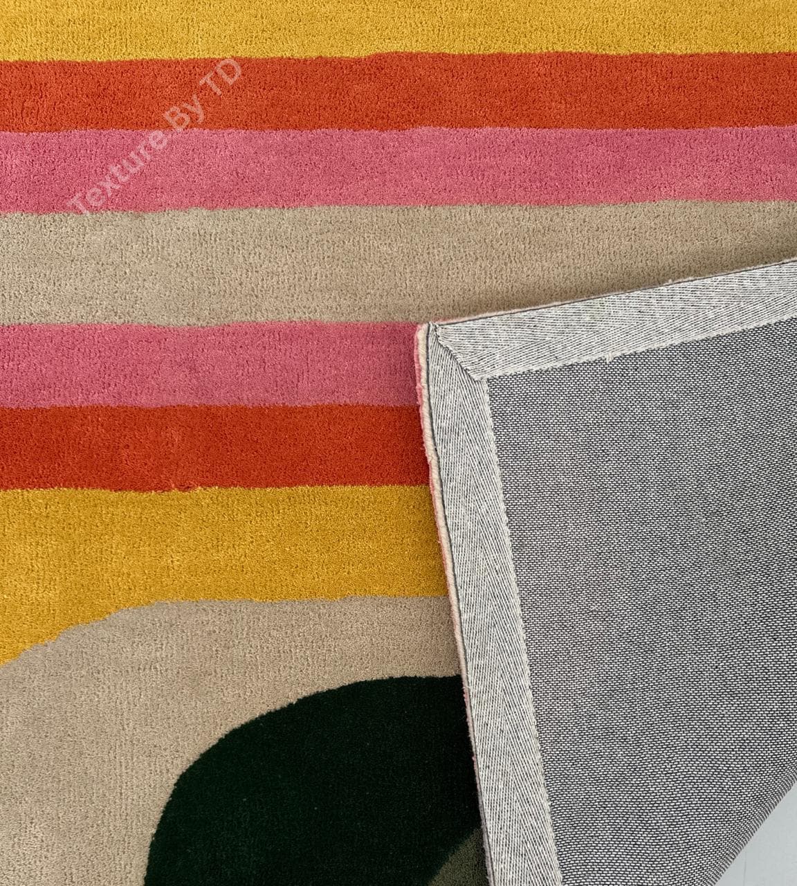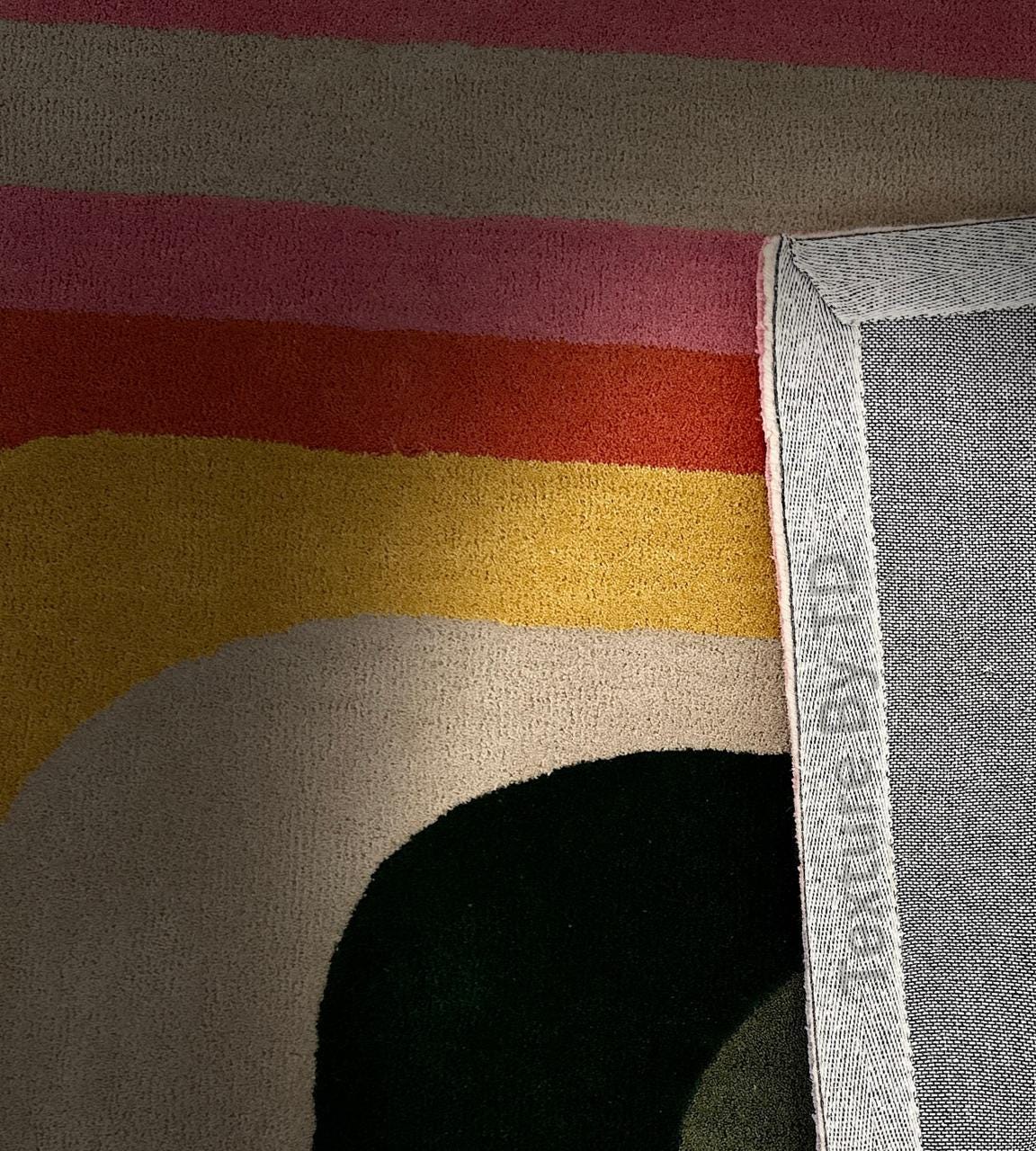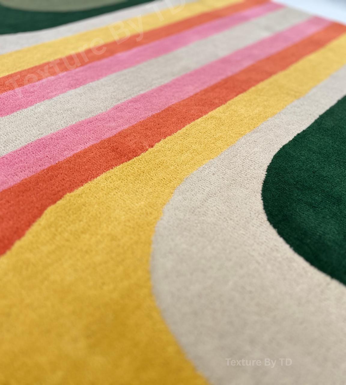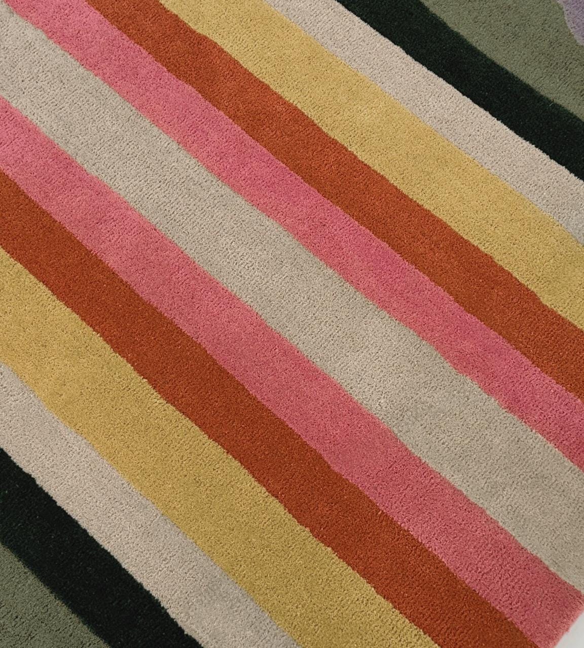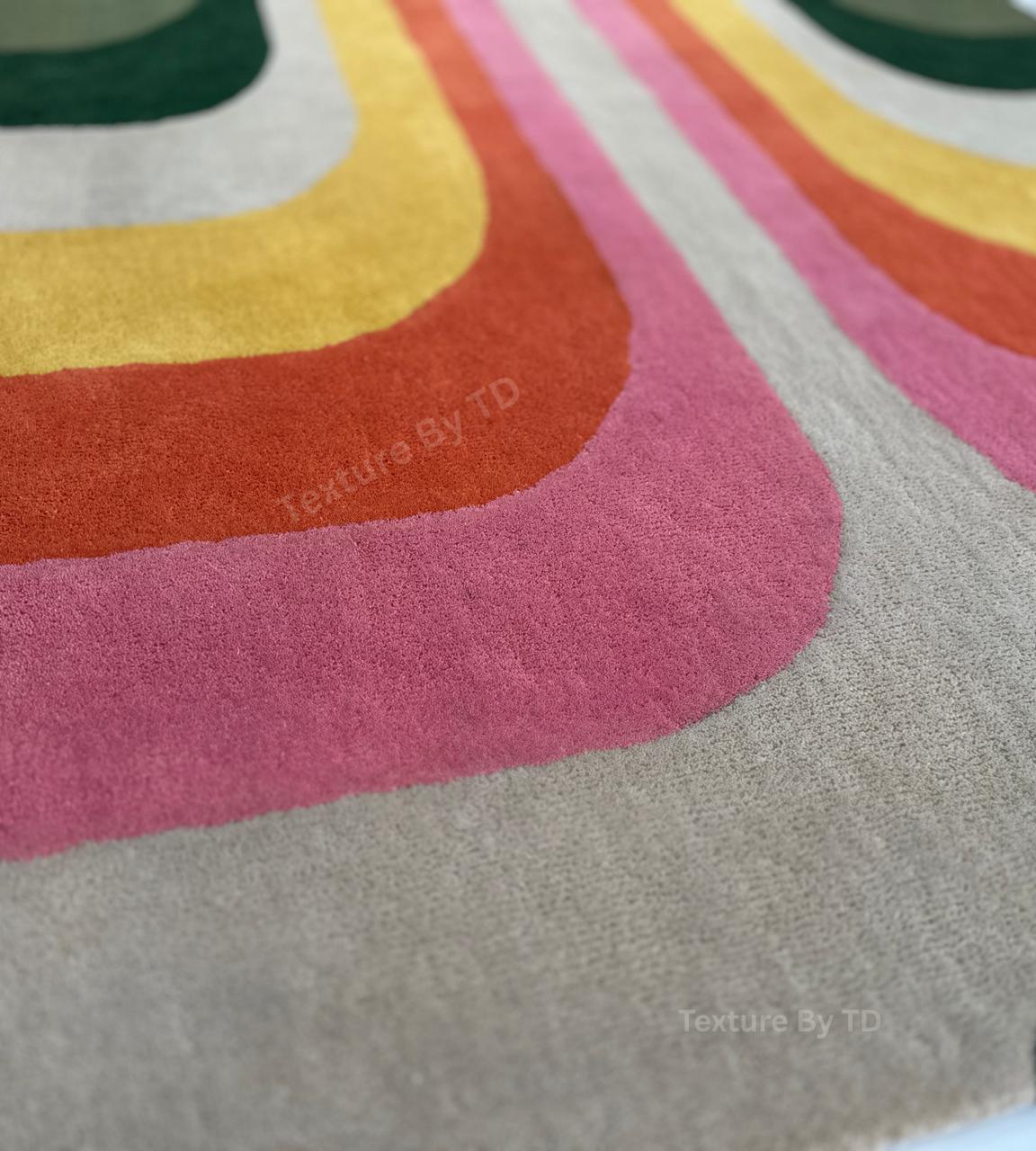 Elevate your living space with this vibrant, retro-inspired area rug. Featuring a stunning symmetrical wave pattern that flows from the center, this rug combines nostalgic 1970s aesthetics with a modern, high-quality finish. The bold arches in shades of sunset pink, mustard yellow, burnt orange, forest green, and lilac purple create a focal point that is both cozy and energetic.