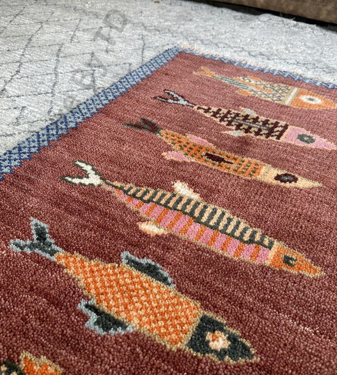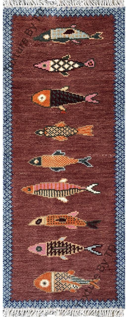 Bring character and craftsmanship into your home with this hand-knotted Turkish fish rug runner, beautifully handmade in Anatolia using high-quality wool. Featuring a charming fish motif, this rug is inspired by traditional Gabbeh and tribal folk art, symbolizing abundance and good fortune.