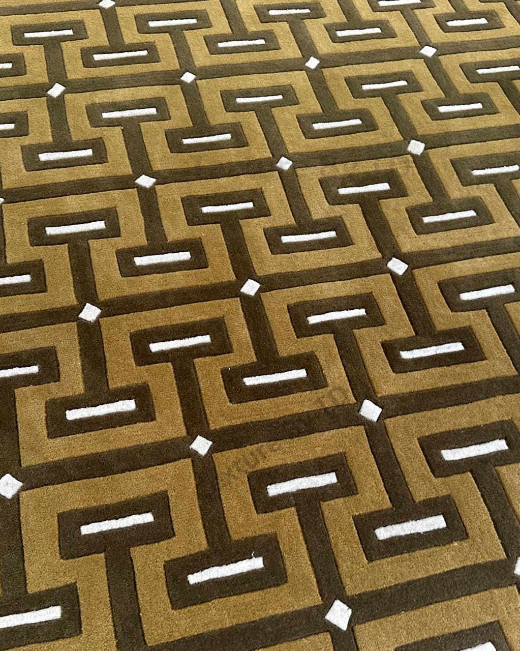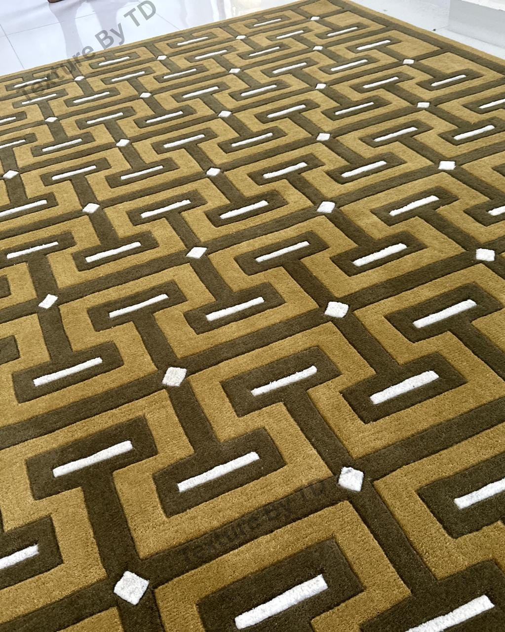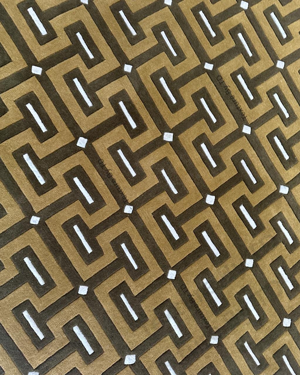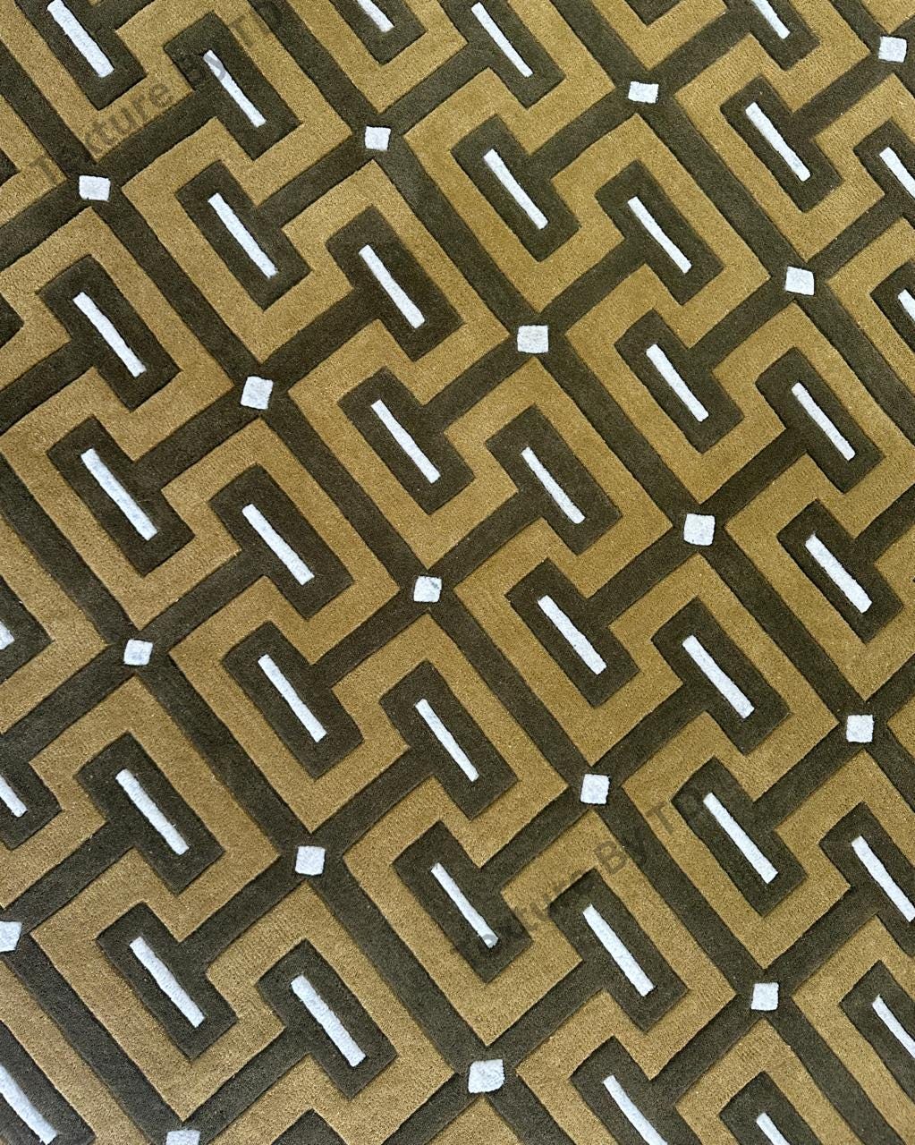 Add warmth and character to your space with this hand tufted carpet, expertly crafted by skilled artisans. Featuring a bold geometric pattern with rhythmic shapes and fine detailing, this rug blends traditional craftsmanship with a modern, artistic feel.