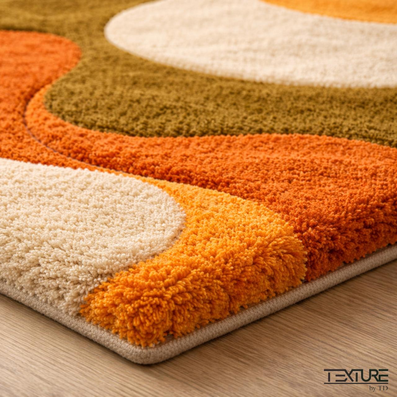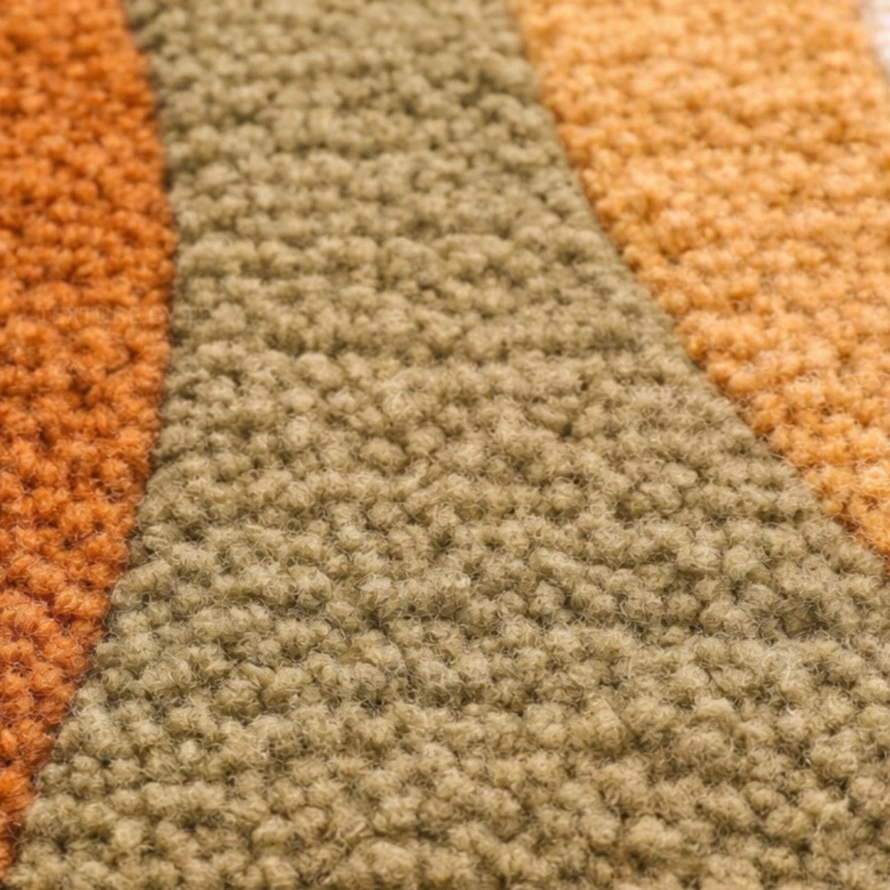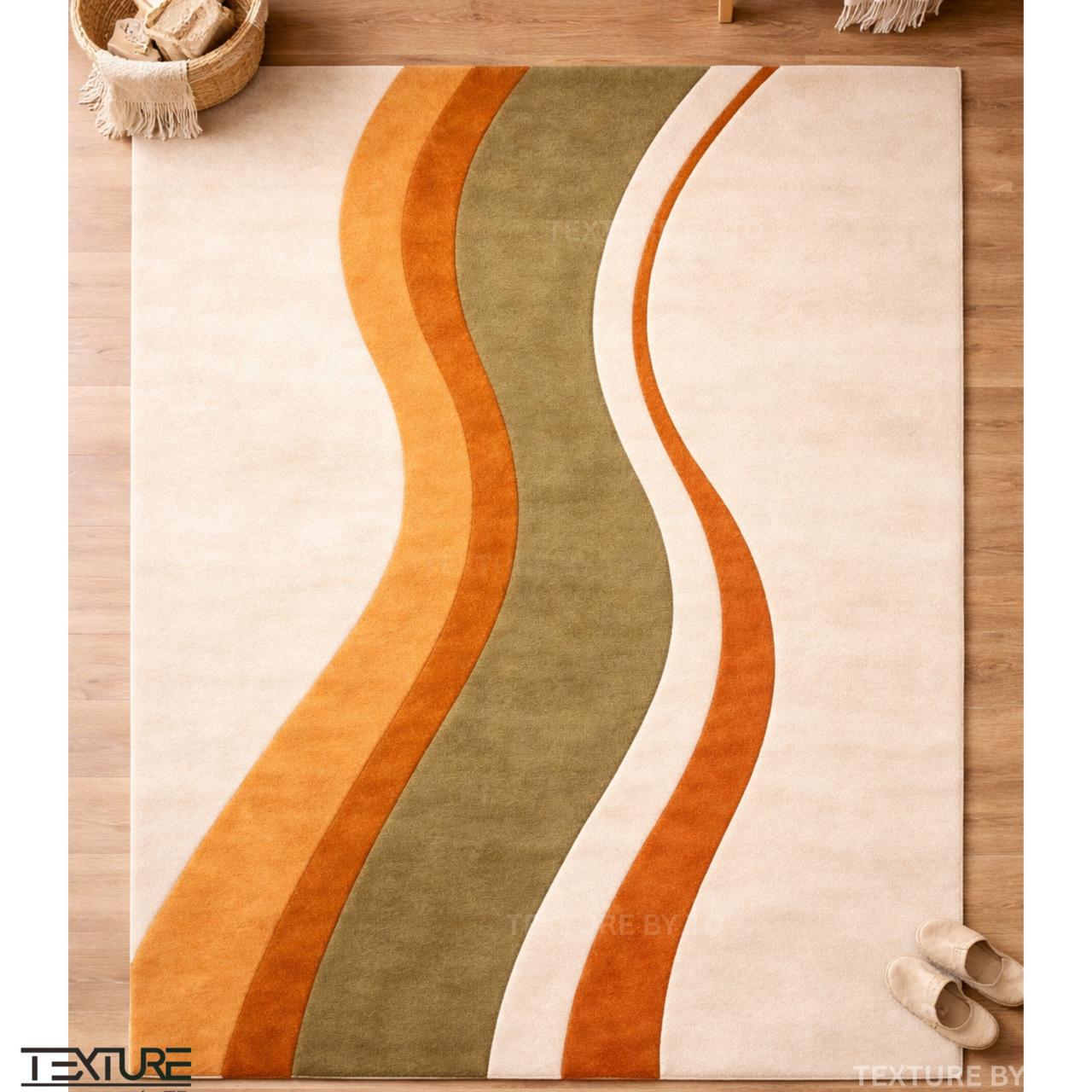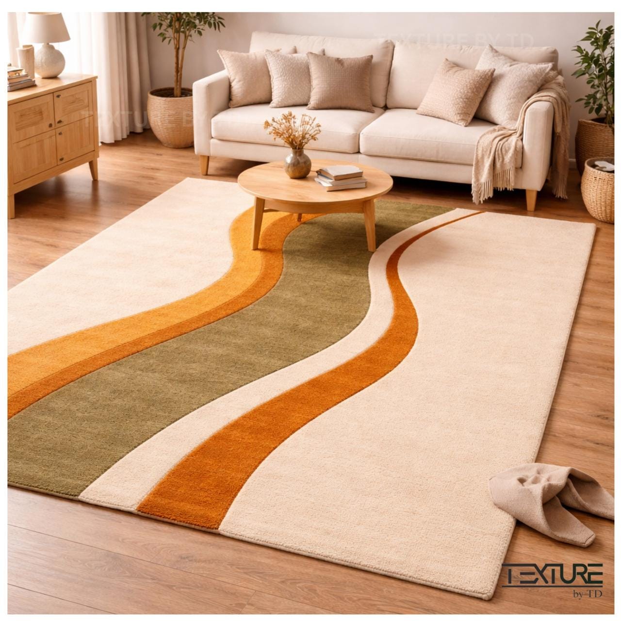Elevate your living space with this stunning Modern Abstract Wool Rug, expertly hand tufted from premium New Zealand wool to bring warmth, texture, and sophisticated style to any room. Featuring a captivating design of flowing wave patterns in warm beige, burnt orange, and olive green, this high-quality area rug creates a calming yet dynamic focal point, perfect for contemporary and modern interiors.