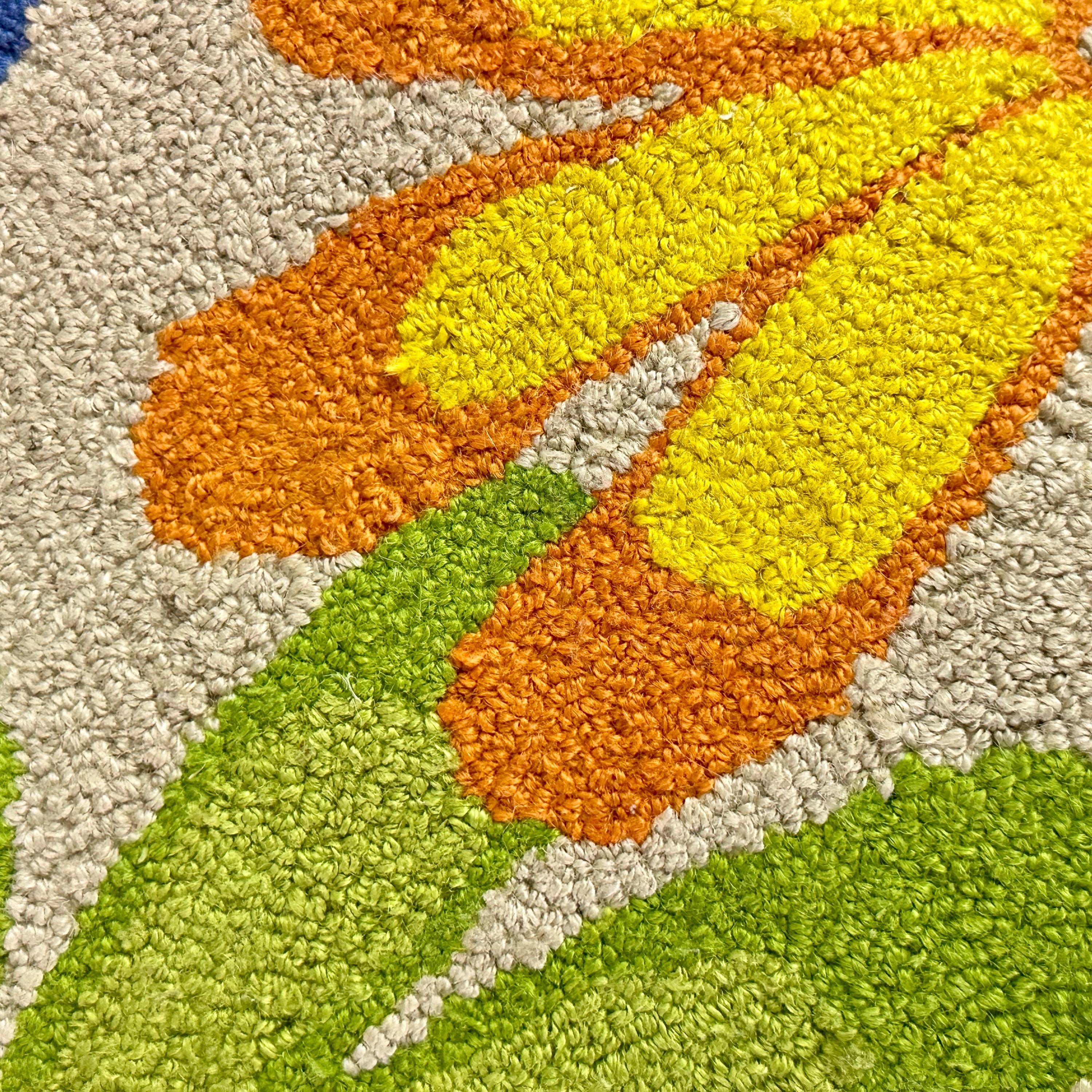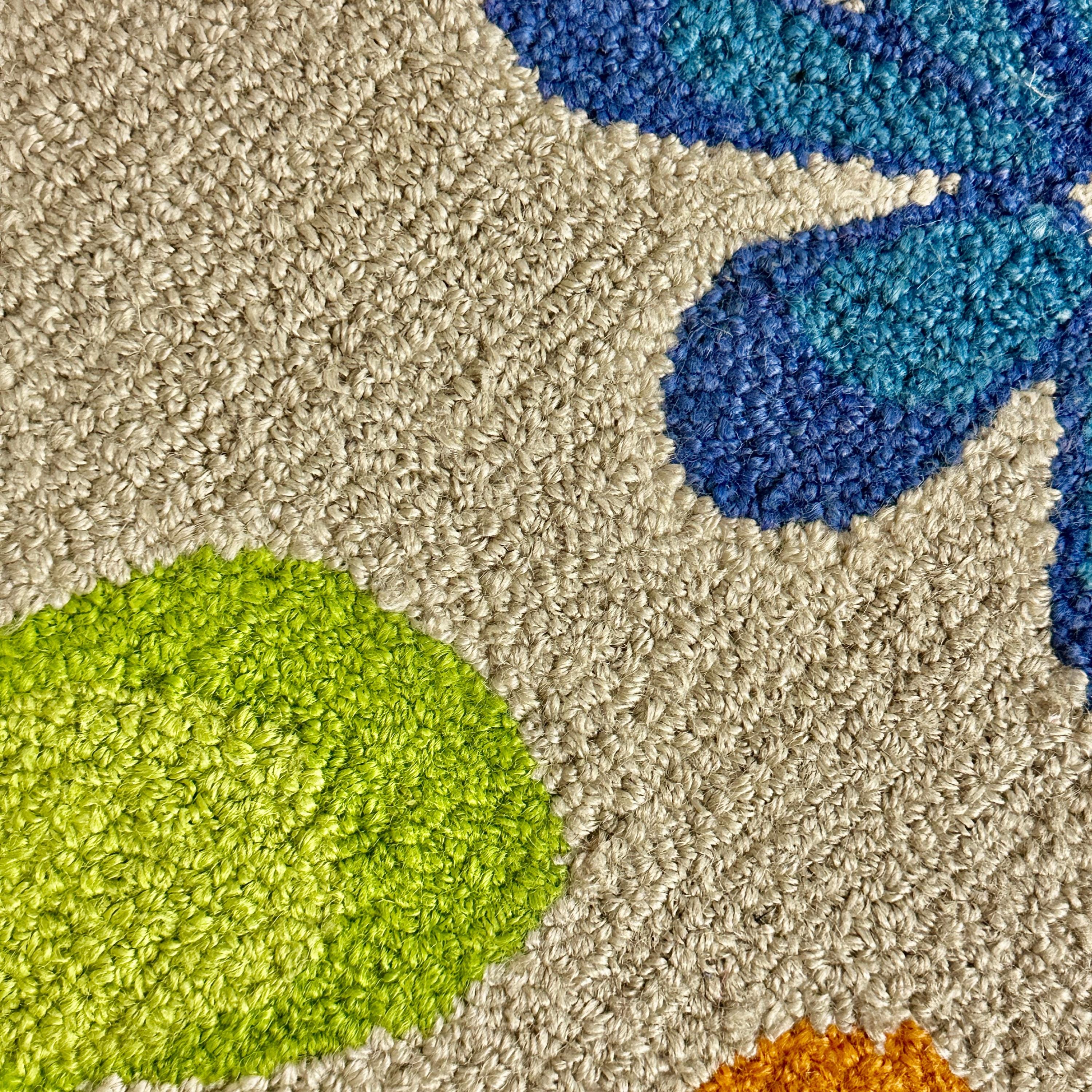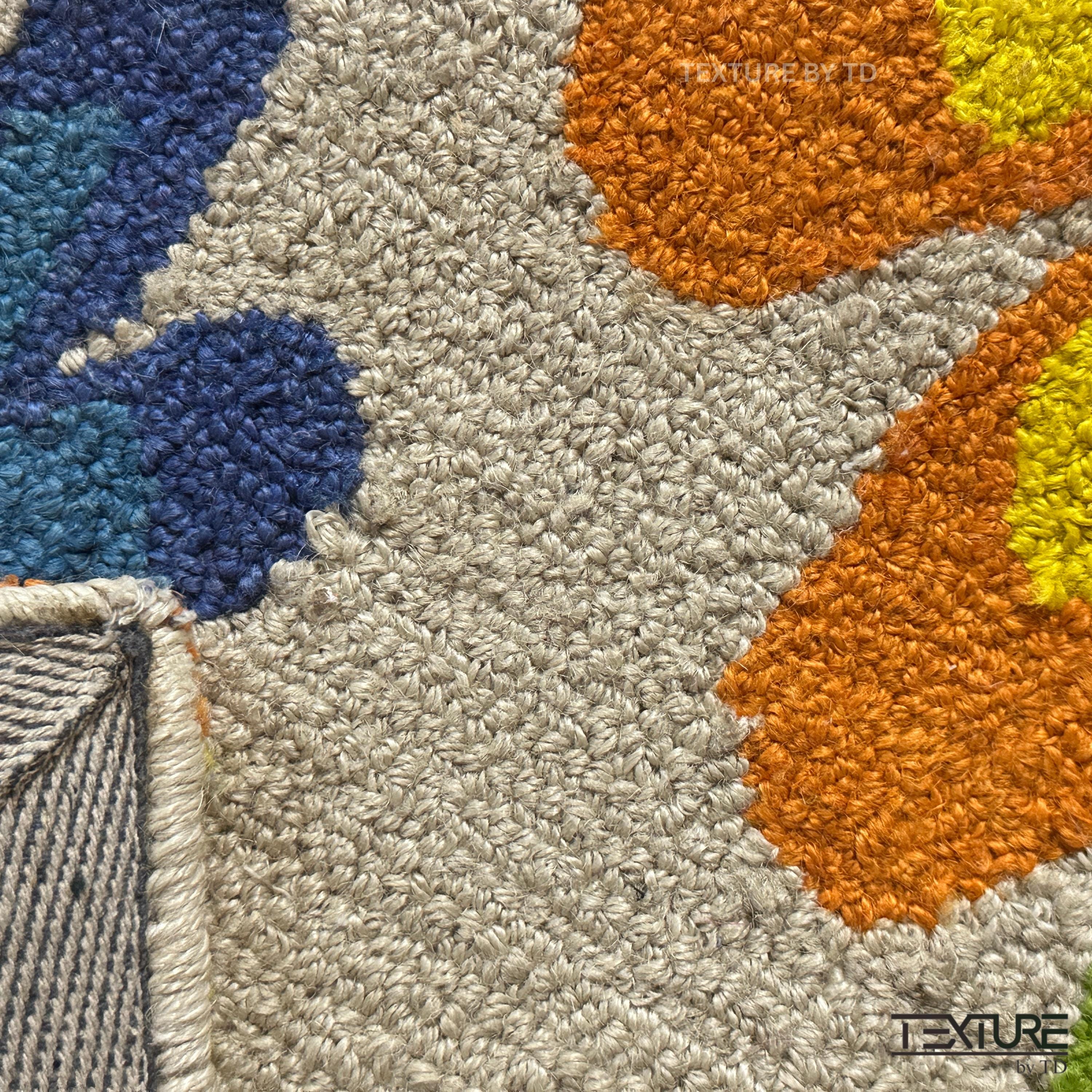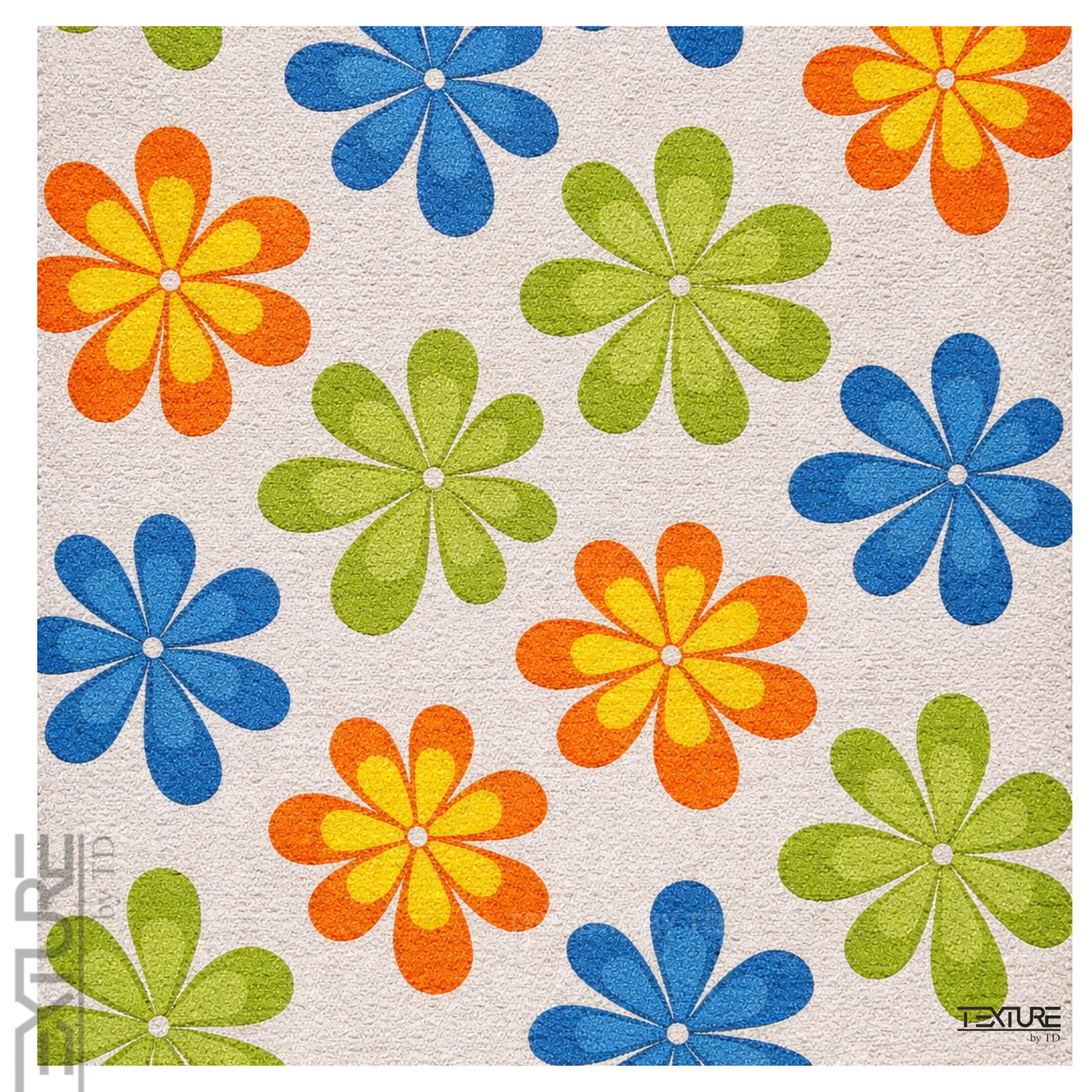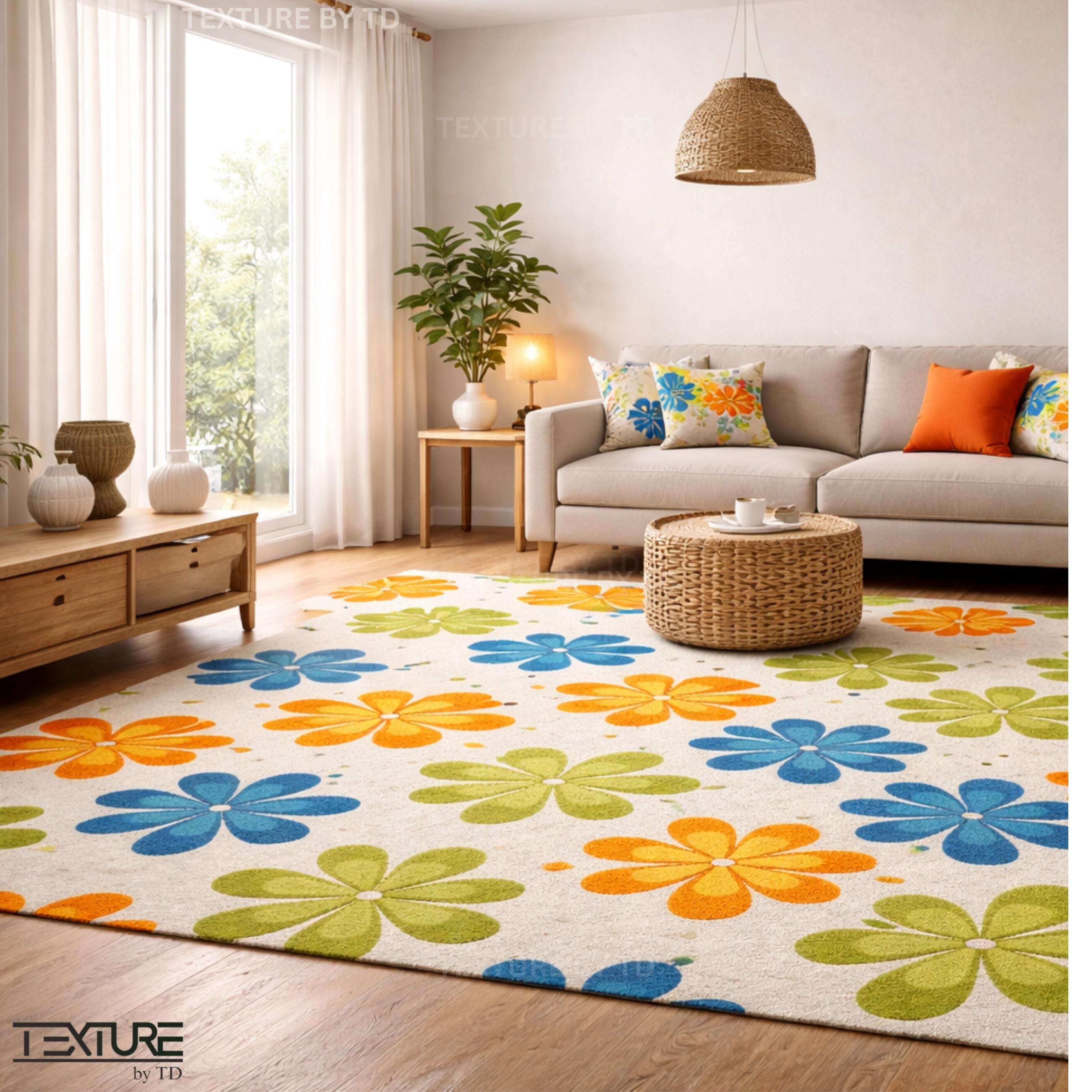 Inspired by retro daisy florals, this rug features bold oversized flowers in vibrant blue, olive green, and warm orange-yellow tones, set against a soft neutral base. The design creates a lively yet balanced look—perfect for interiors that need a touch of personality without feeling overwhelming.