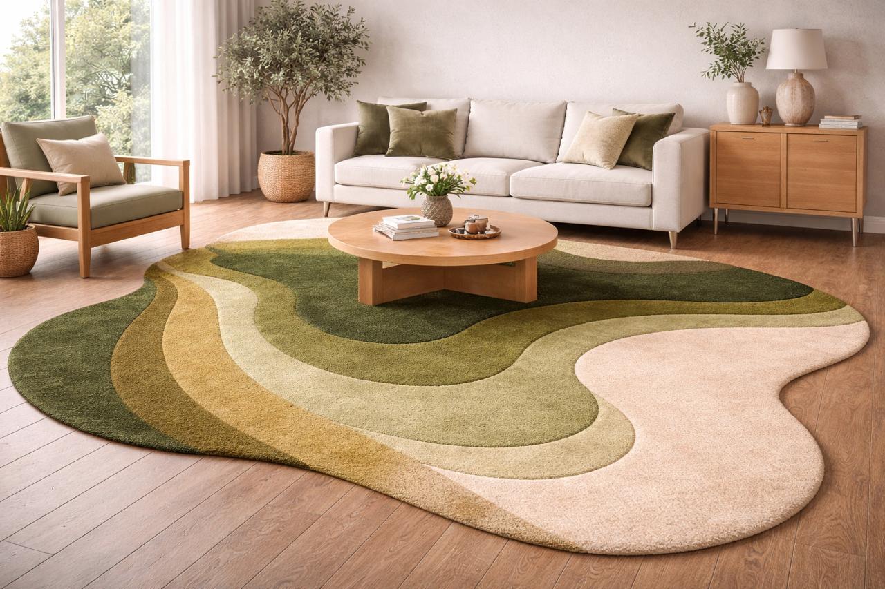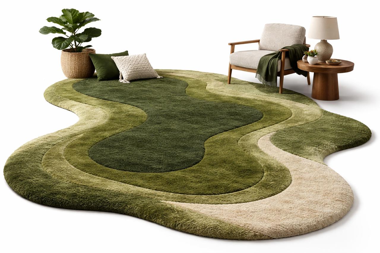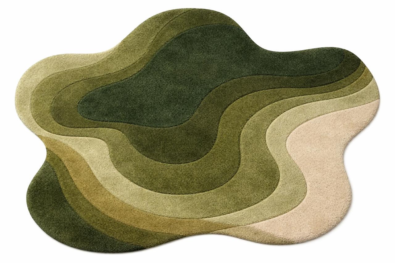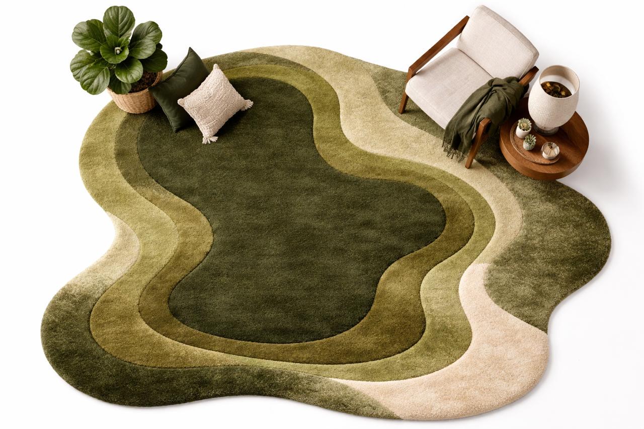 Bring a calm, natural feeling into your home with this hand tufted pebble-style carpet. Designed in soft rounded forms and layered shades of sage green, moss, olive, cream, and charcoal, this rug creates a warm, organic look that feels both modern and timeless.