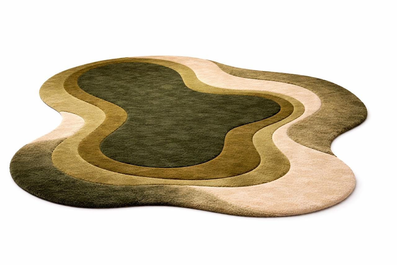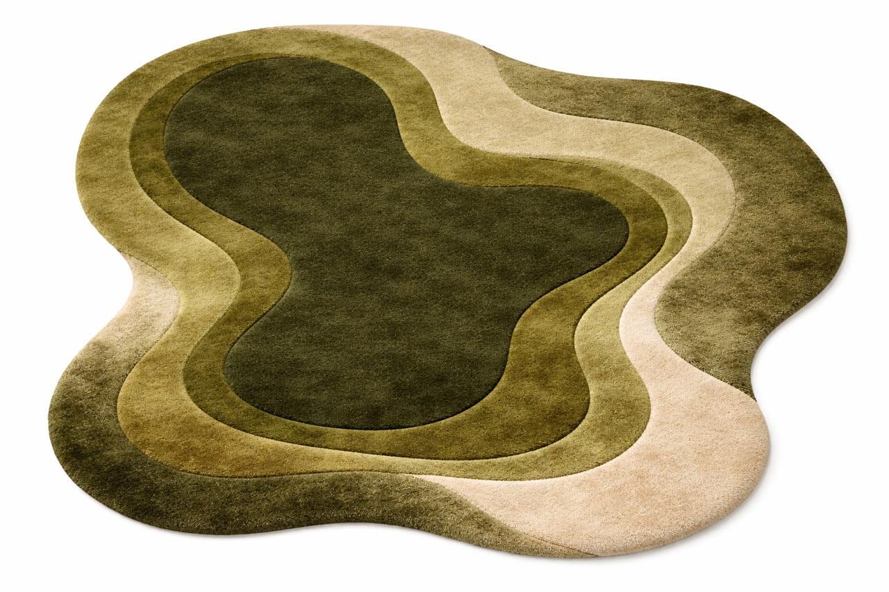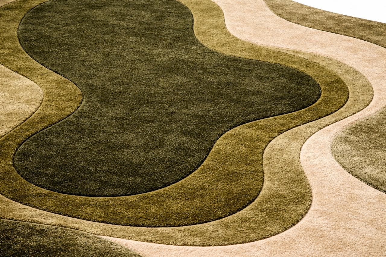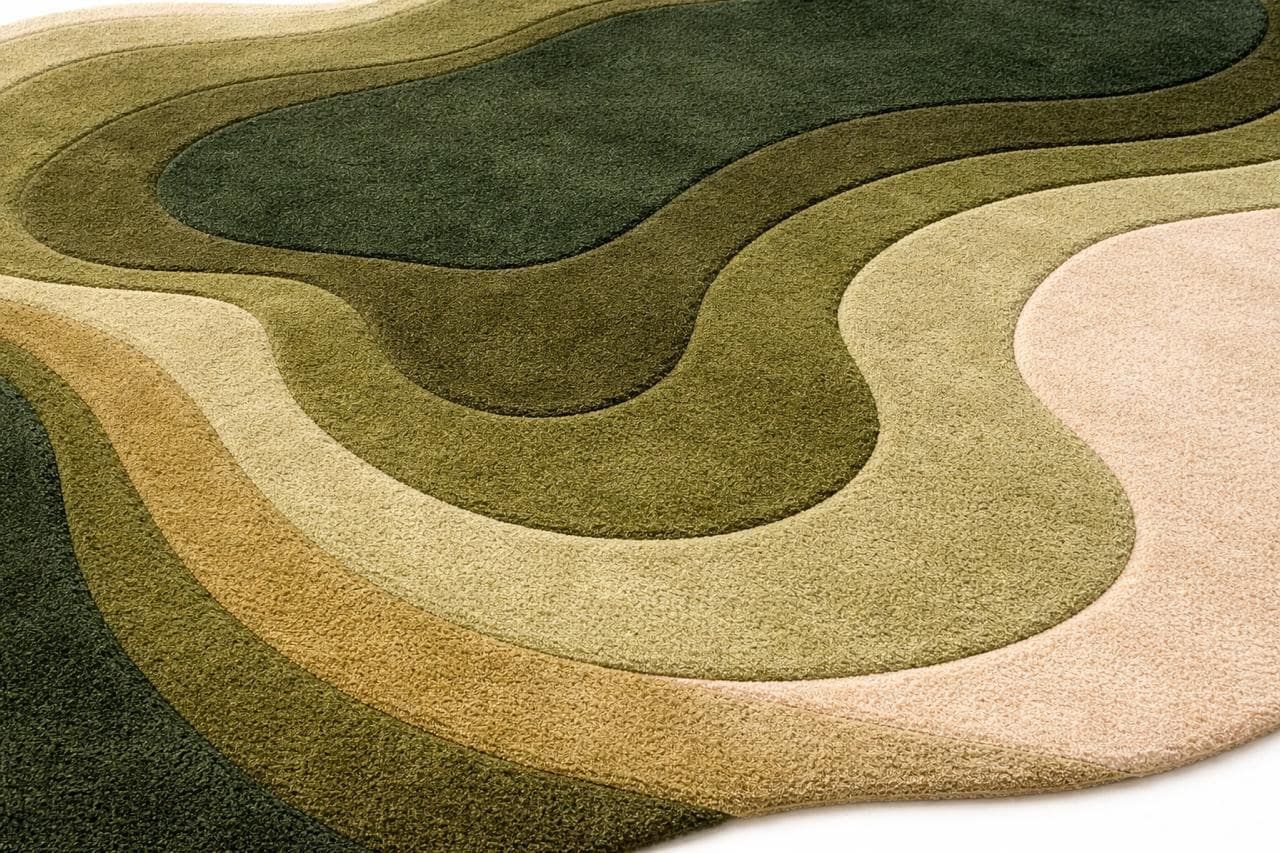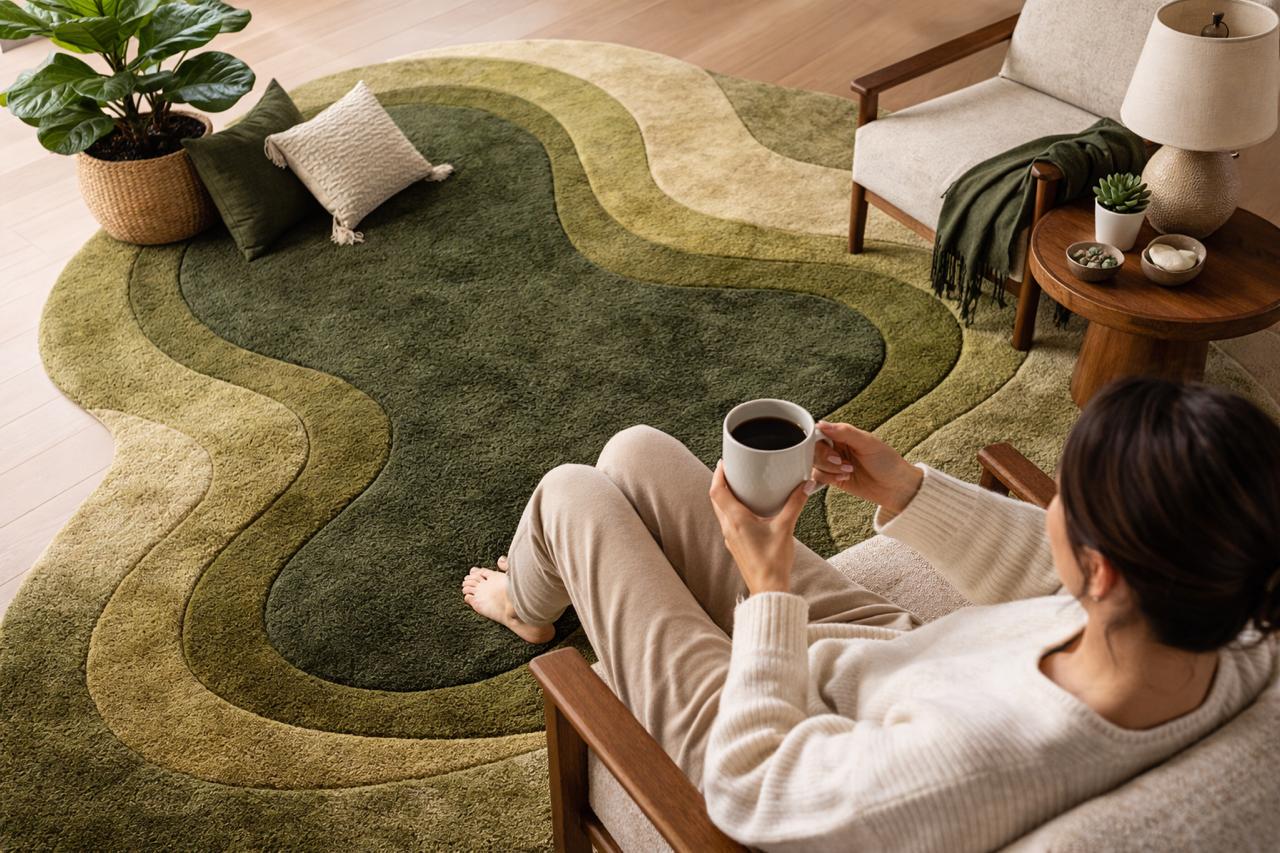 Bring a calm, natural feeling into your home with this hand tufted pebble-style carpet. Designed in soft rounded forms and layered shades of sage green, moss, olive, cream, and charcoal, this rug creates a warm, organic look that feels both modern and timeless.