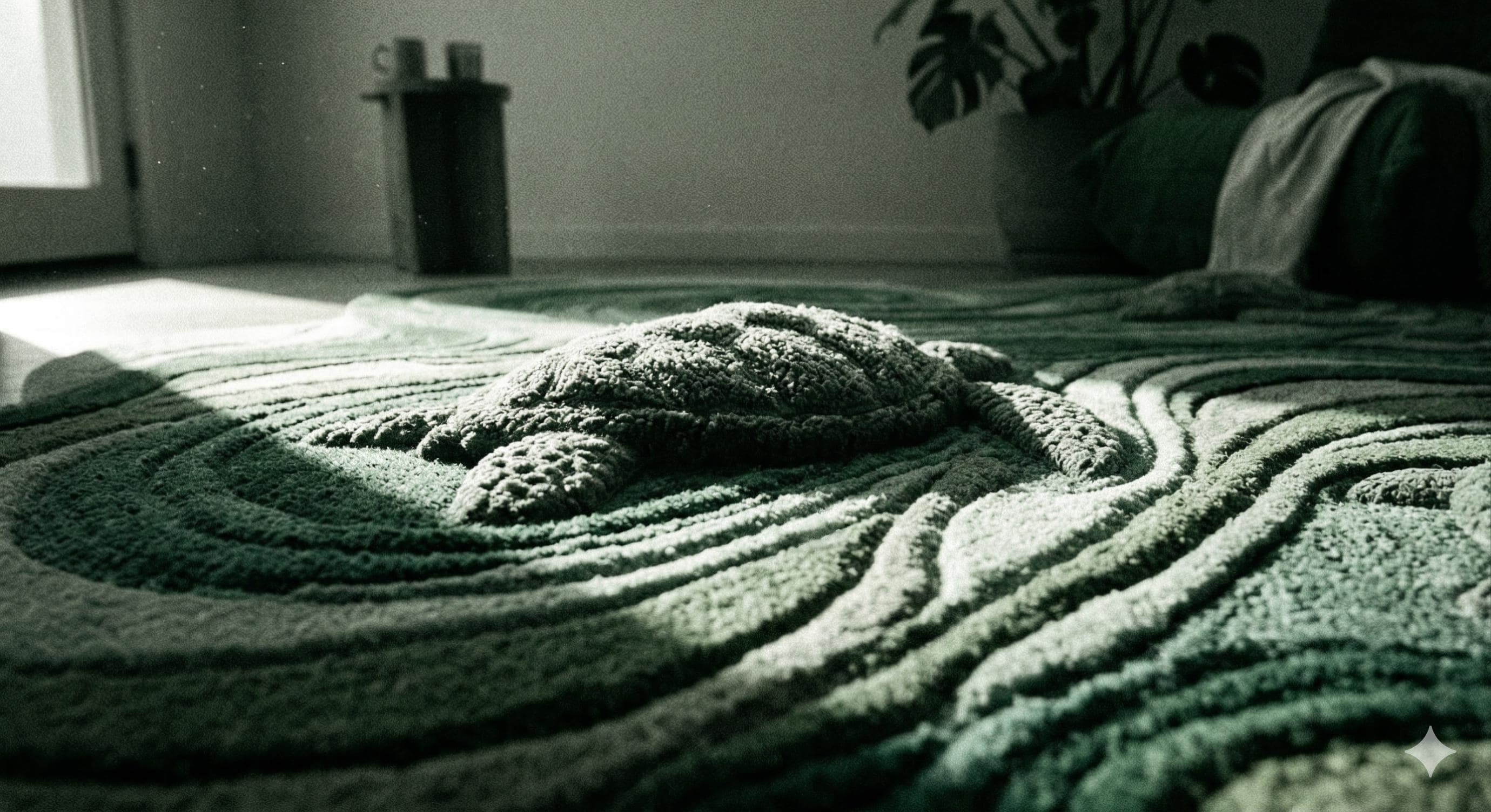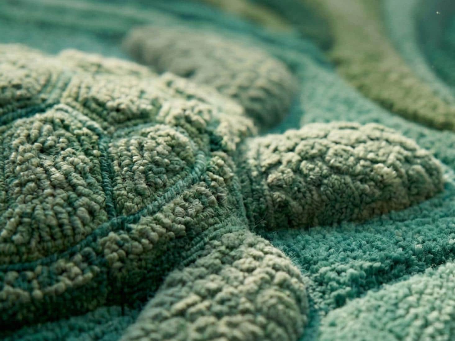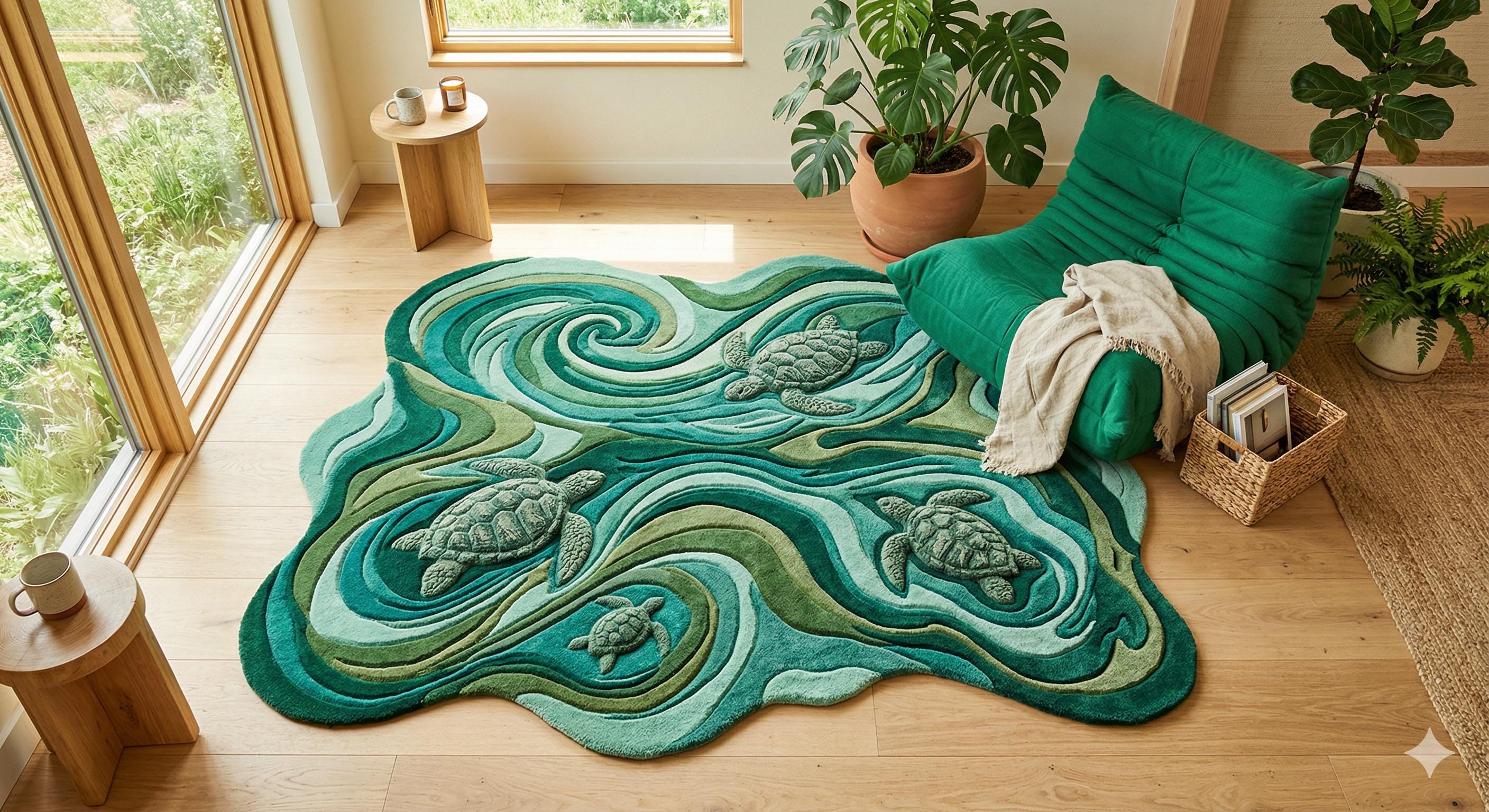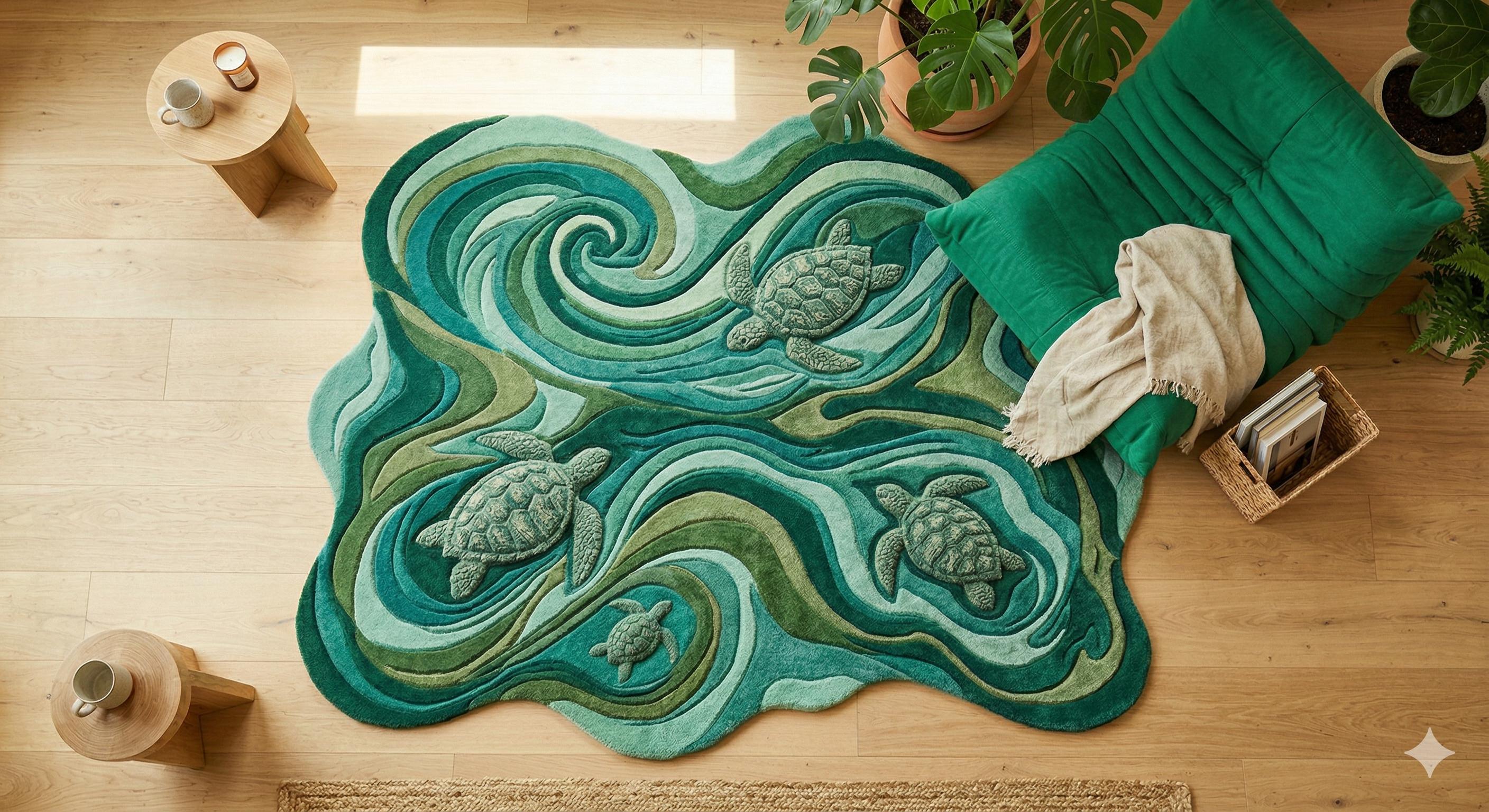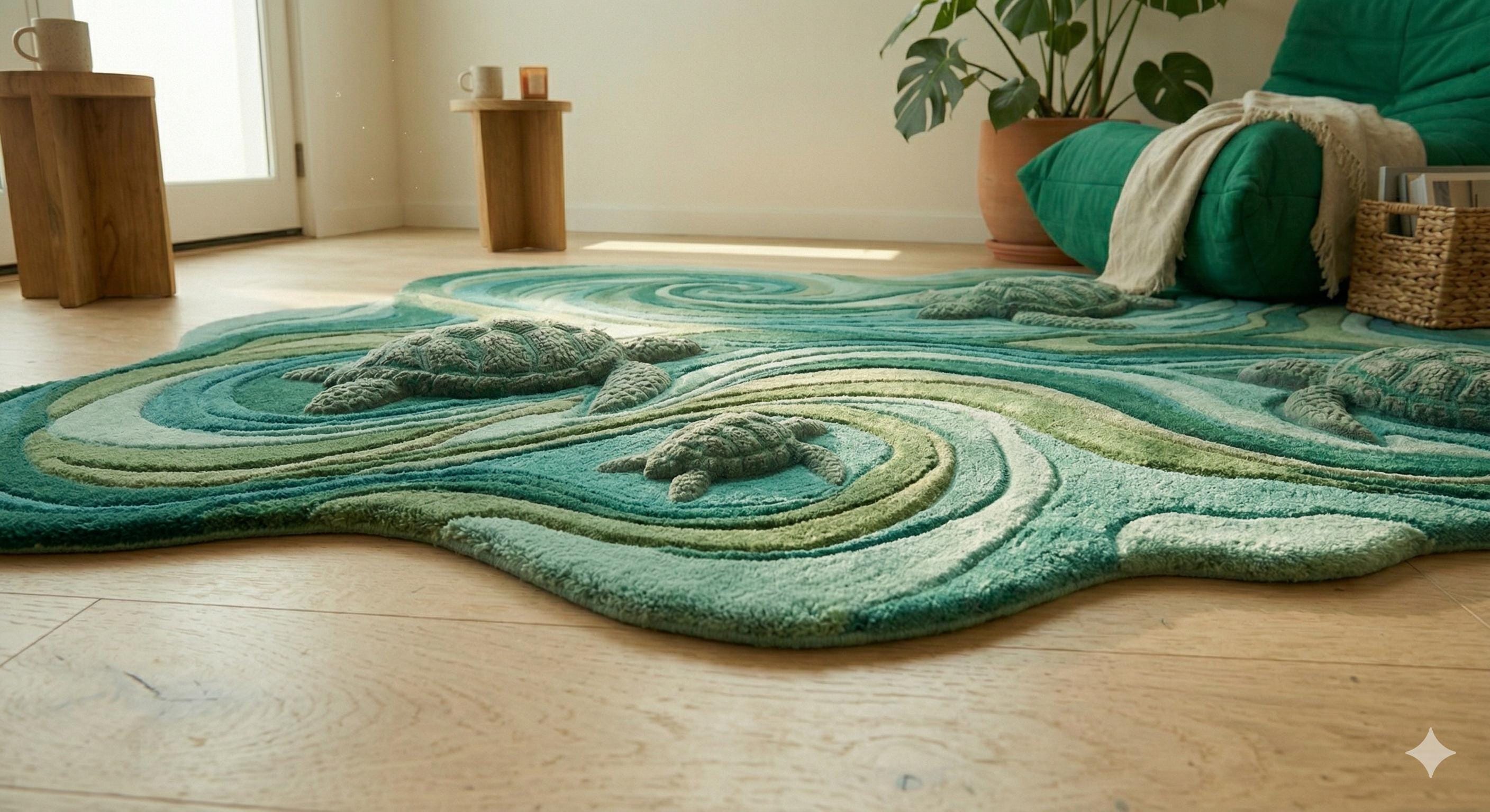 Inspired by flowing sea waves and graceful turtles, this hand tufted rug is a unique artistic piece that transforms your space into a peaceful coastal retreat. The organic shape and layered textures create a sculpted, 3D surface that feels soft, warm, and luxurious underfoot.