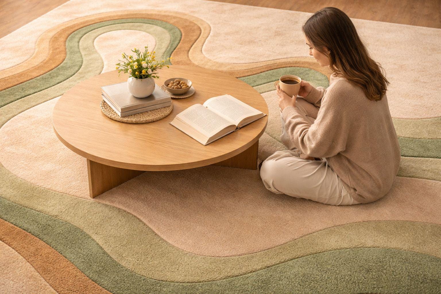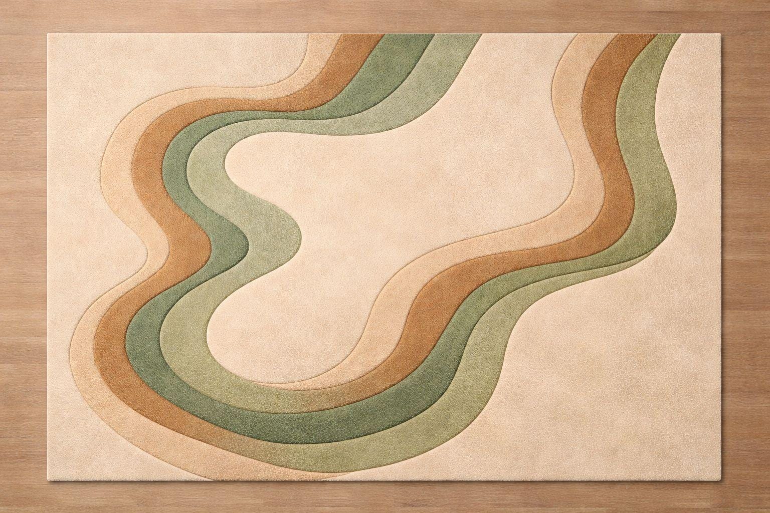Bring warmth, texture, and modern elegance into your space with this beautifully handcrafted hand-tufted rug. Designed in a soothing ecru beige base with flowing abstract curves in earthy green and warm brown tones, this rug adds a subtle yet artistic statement to any room.