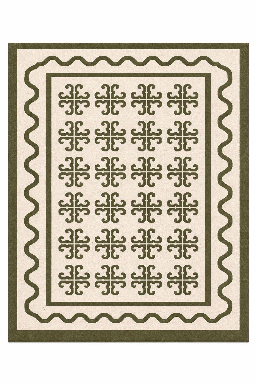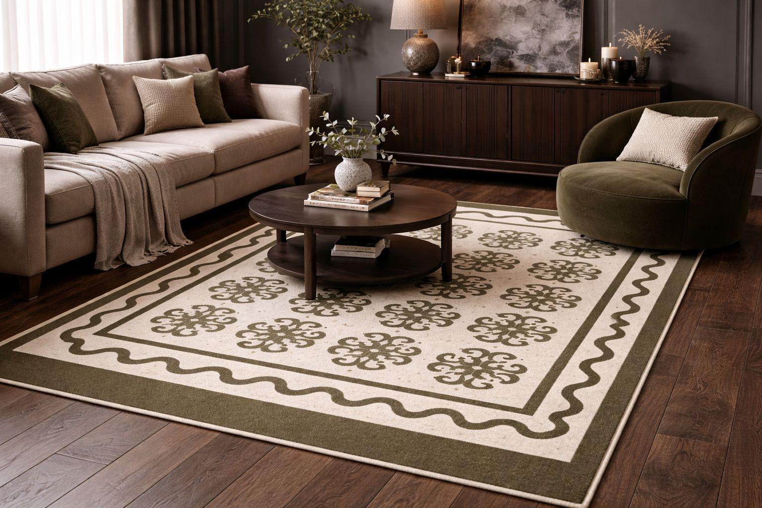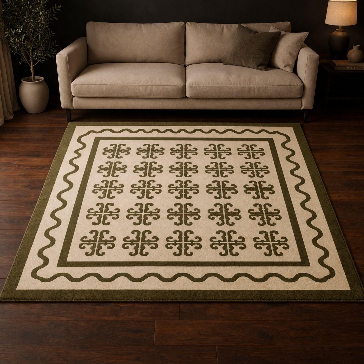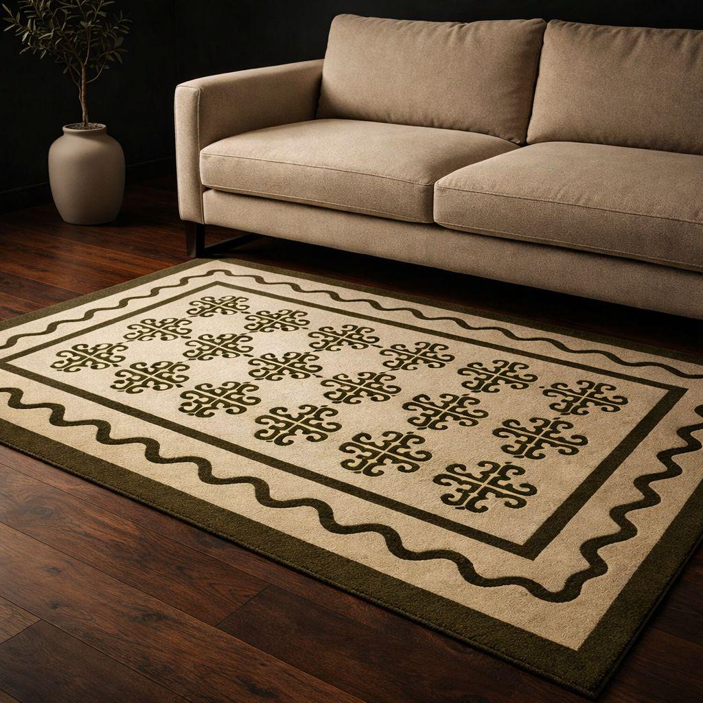 Featuring a soft ivory base with deep olive motifs, this rug blends Japandi simplicity with contemporary luxury, making it a perfect statement piece for living rooms, bedrooms, or designer spaces.