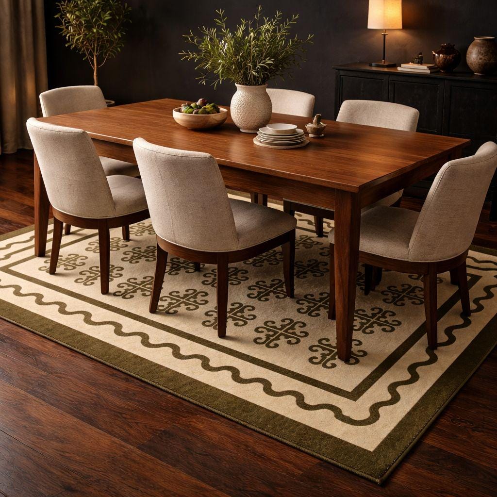 The structured border and repeating pattern create a sense of calm rhythm, while the rich tones pair beautifully with wooden floors, neutral sofas, and warm lighting.