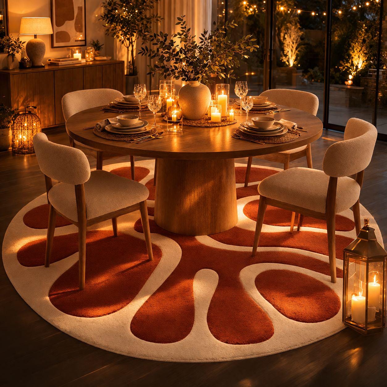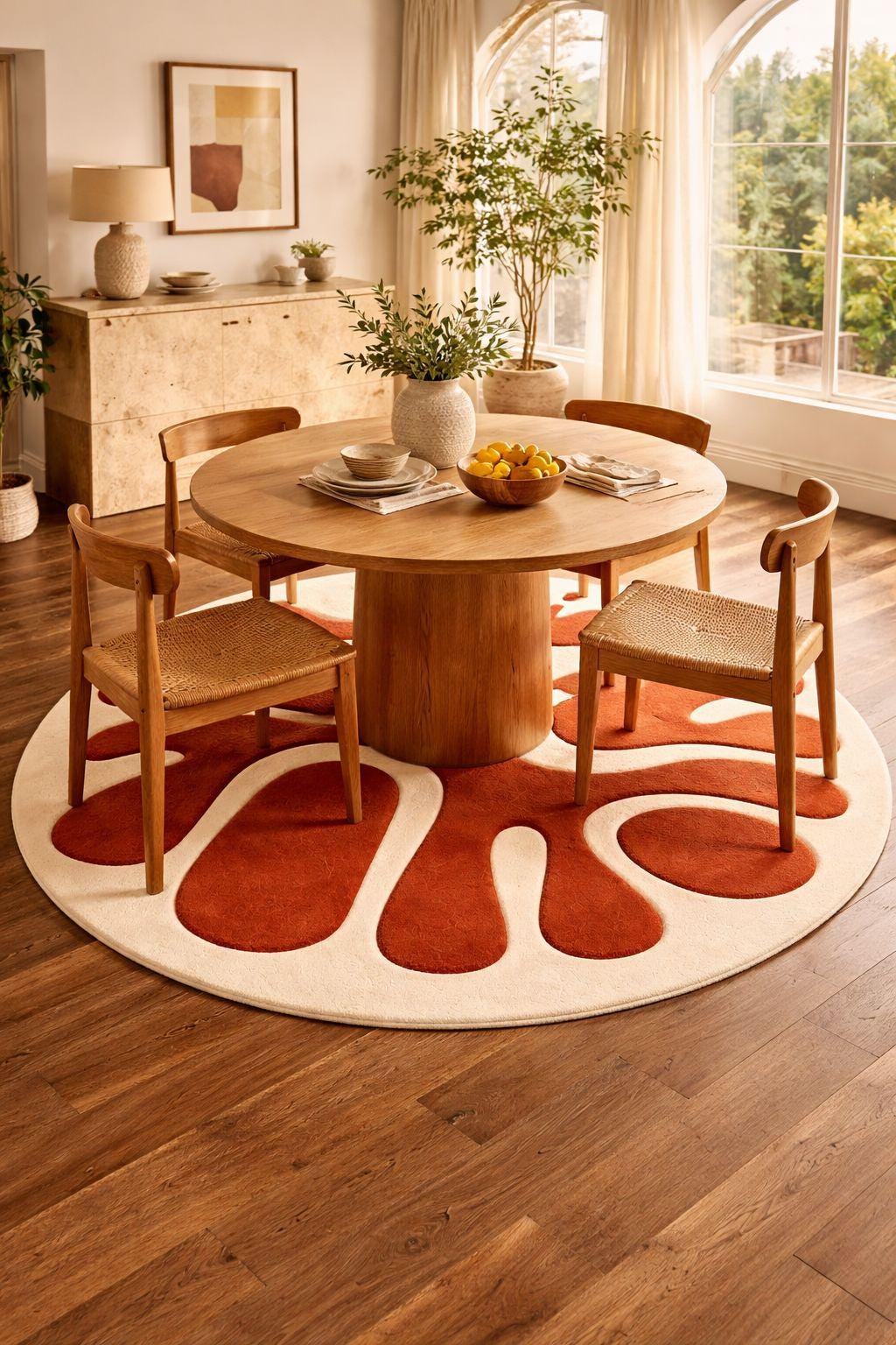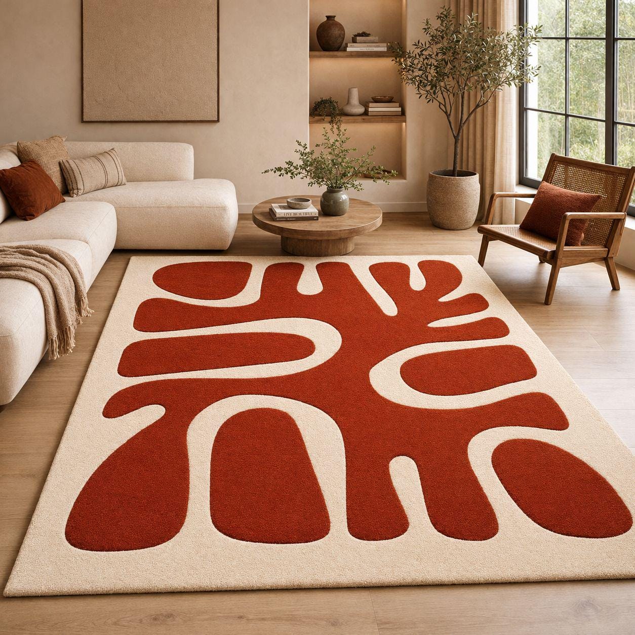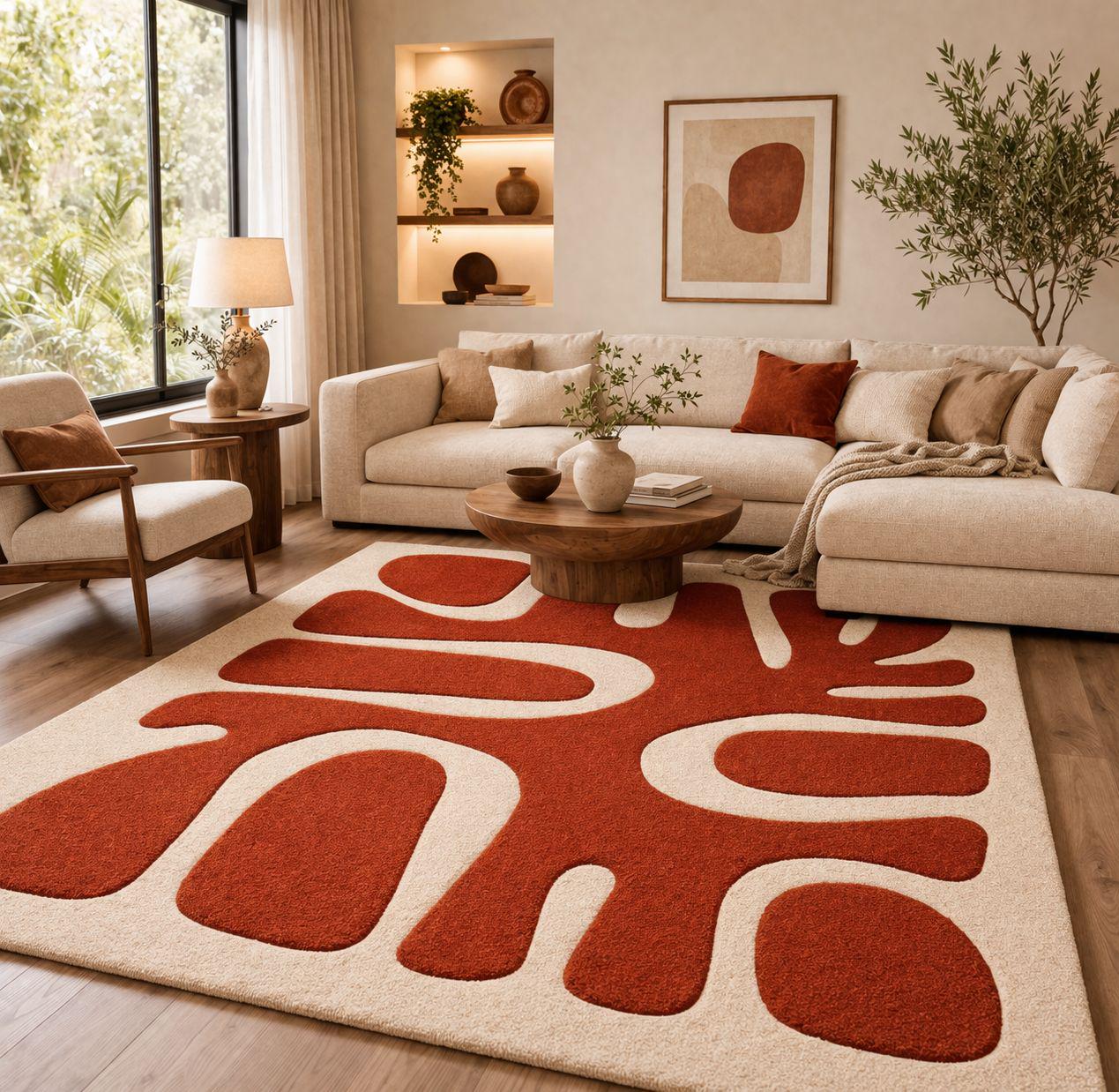 The bold Radiant Earth (terracotta) pattern combined with a soft Ecru base creates a perfect balance of statement and elegance.