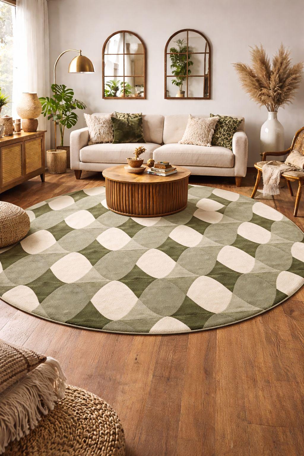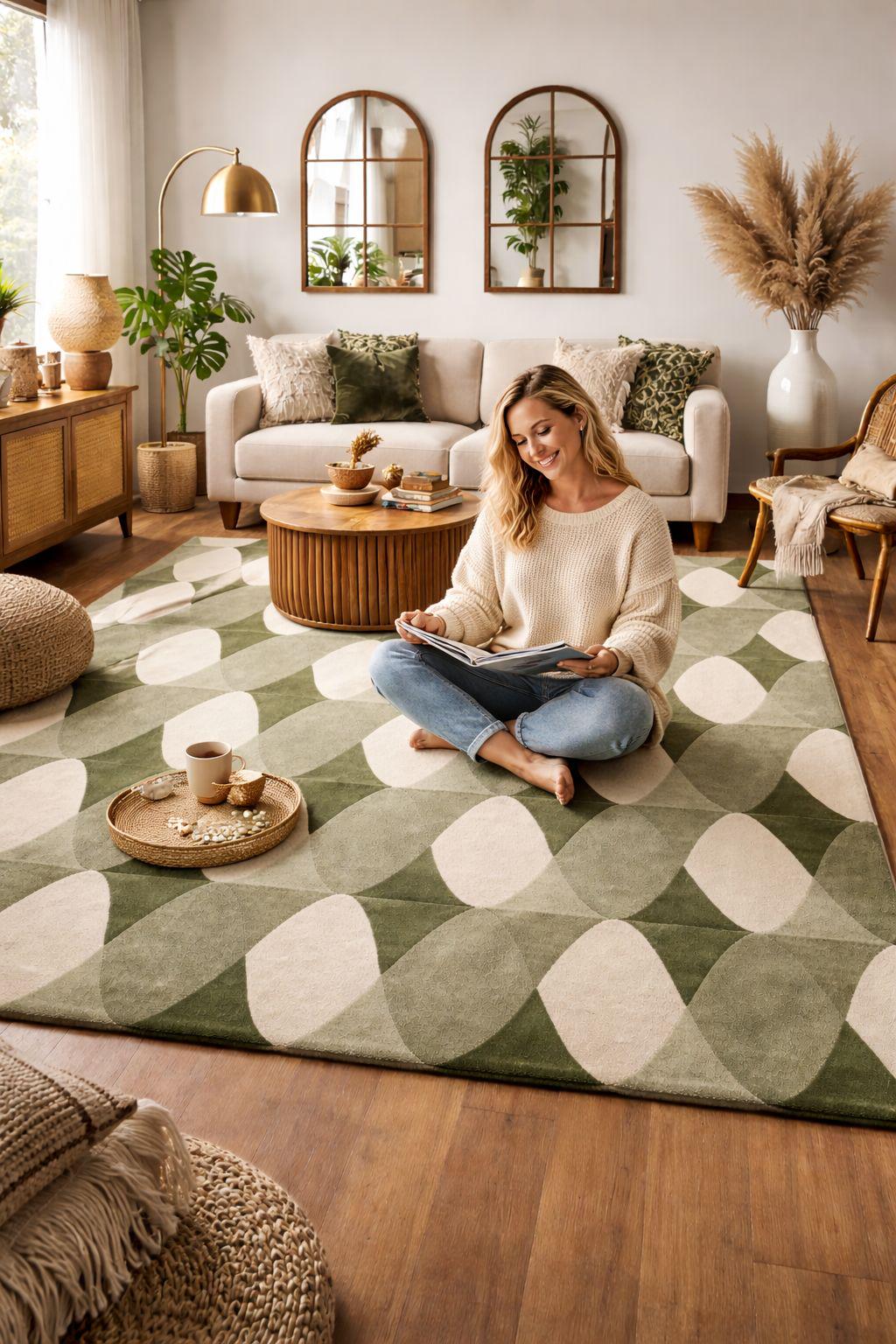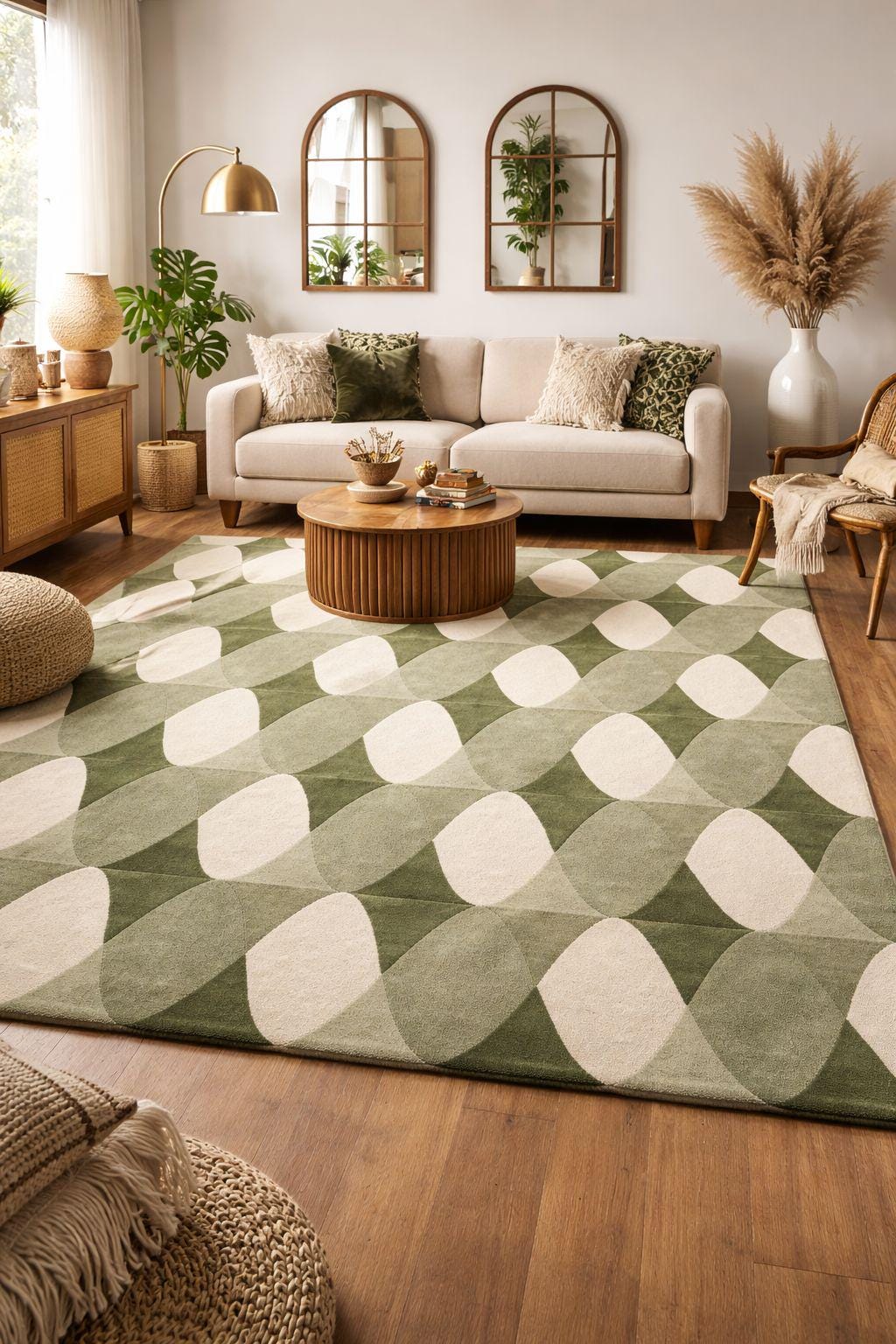 Bring timeless retro charm into your space with this 70s-inspired Mid Century Modern geometric rug, featuring a soothing palette of olive green, sage, and cream tones. The repeating abstract oval pattern creates a sense of rhythm and movement, making it a perfect statement piece for both modern and vintage interiors.
