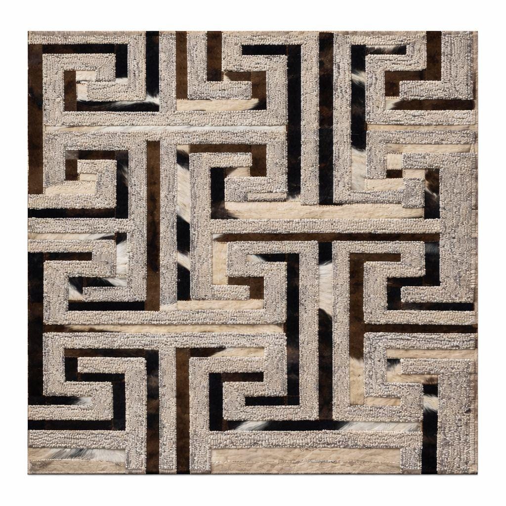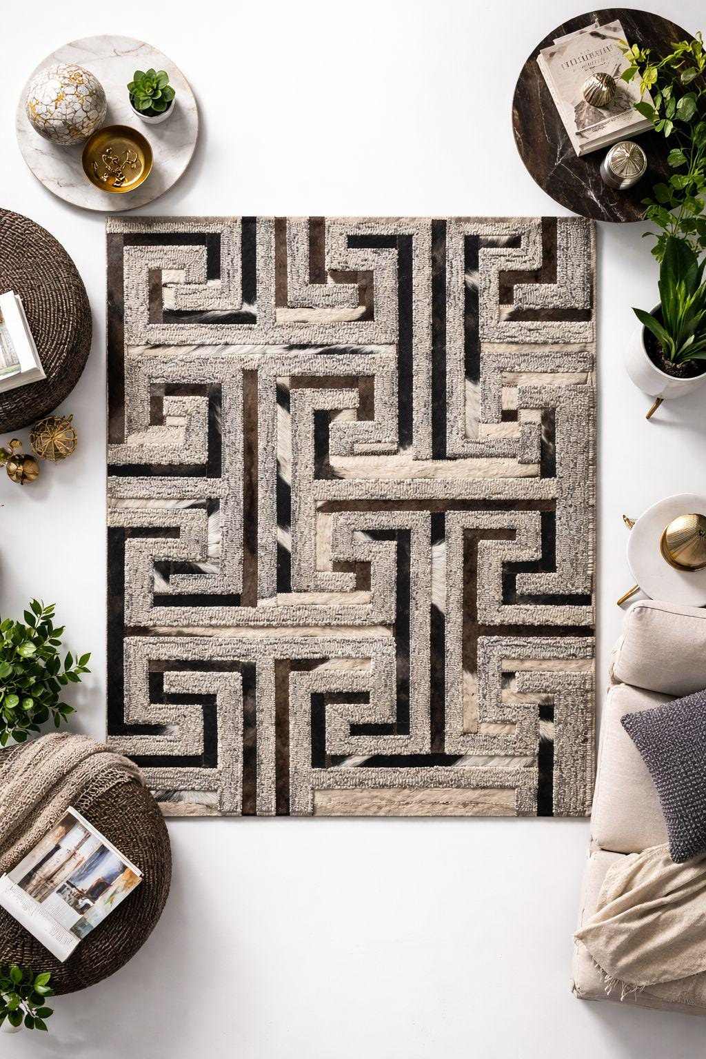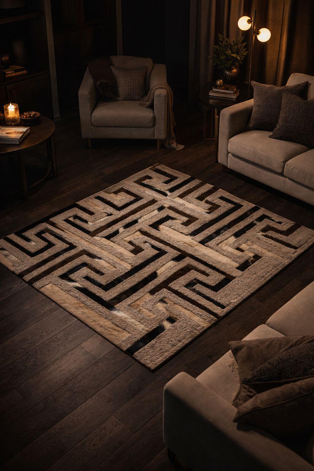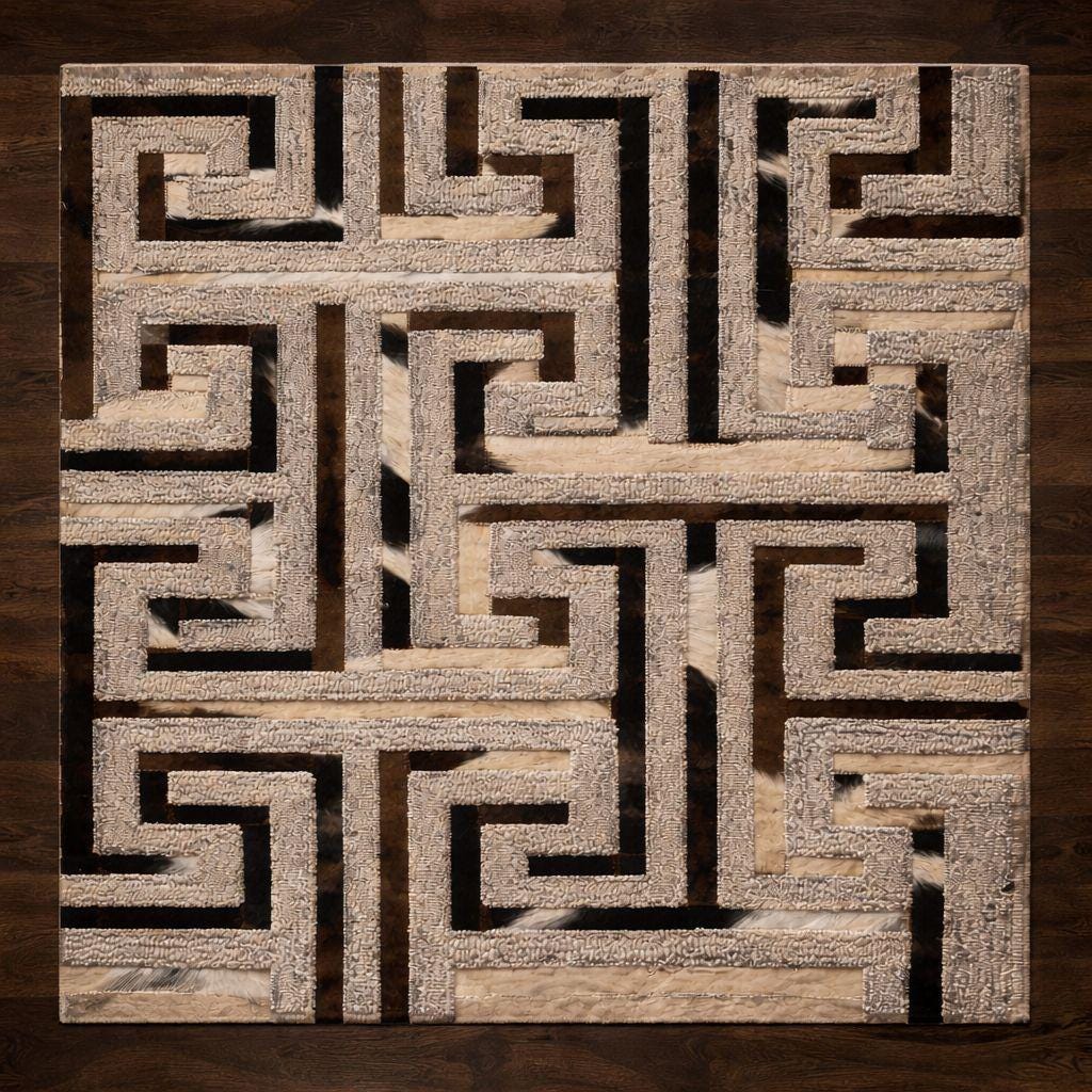Elevate your space with this luxurious handmade rug crafted from premium natural leather and soft wool by Designer T.D. Designed with a bold geometric maze pattern, this piece blends texture, depth, and modern elegance into one striking statement.