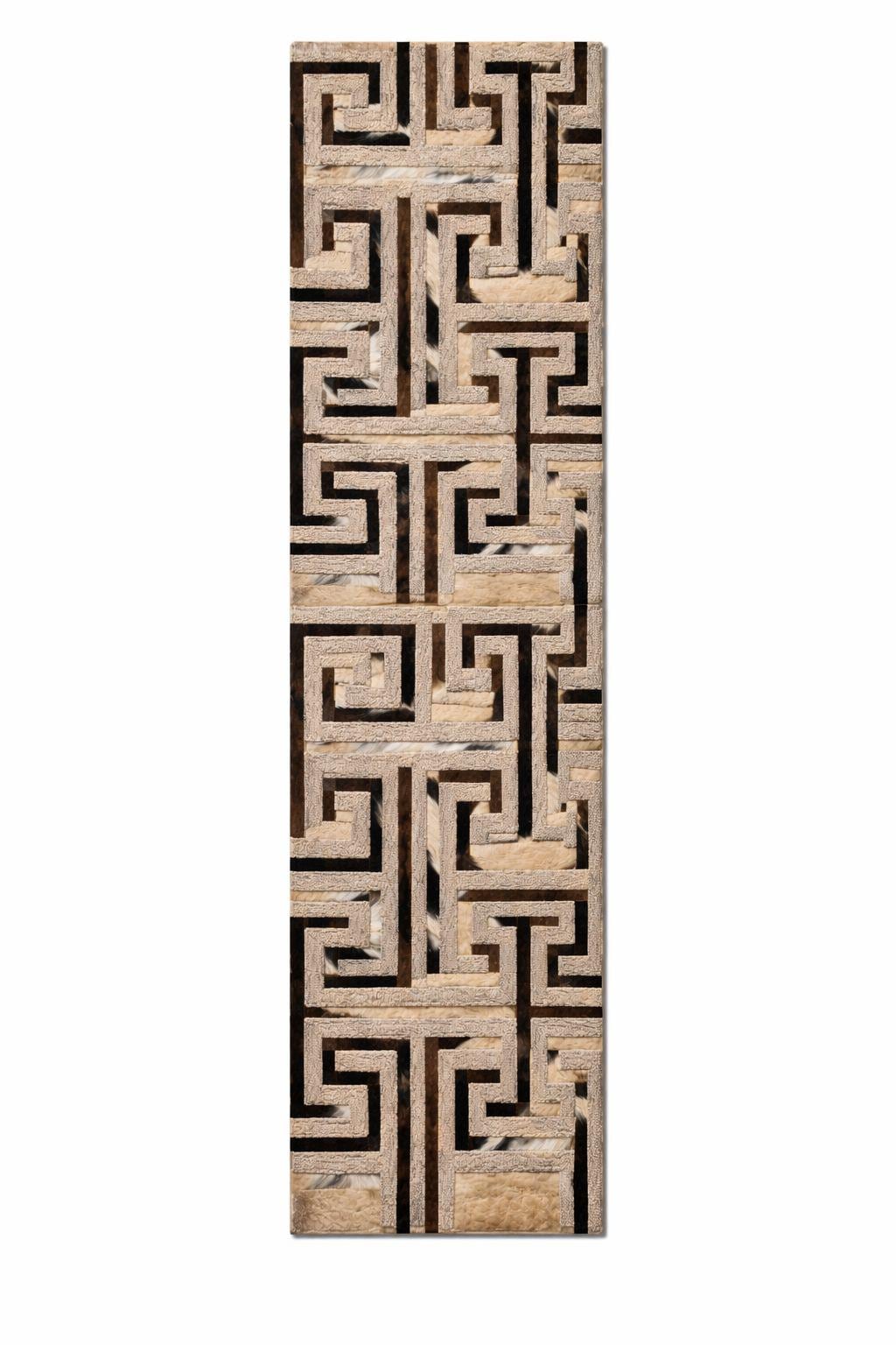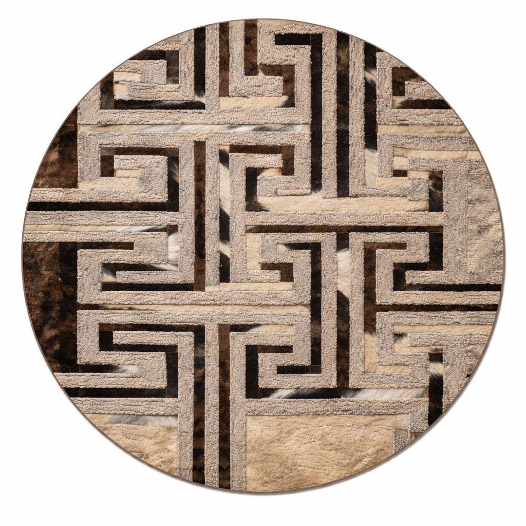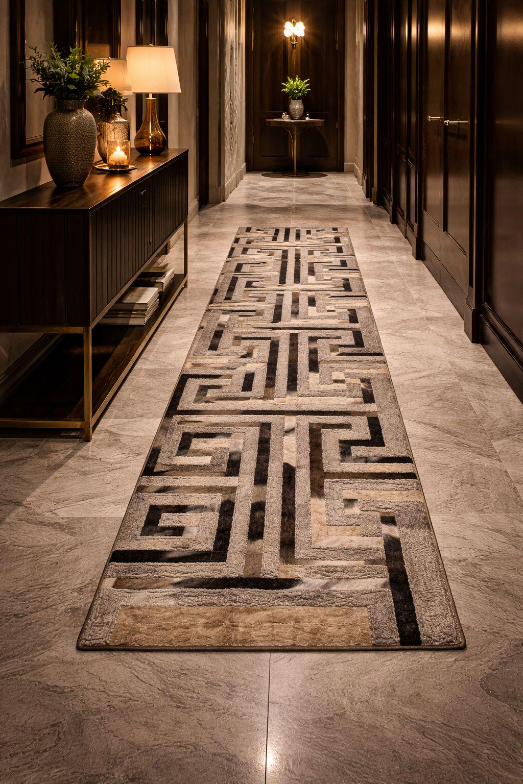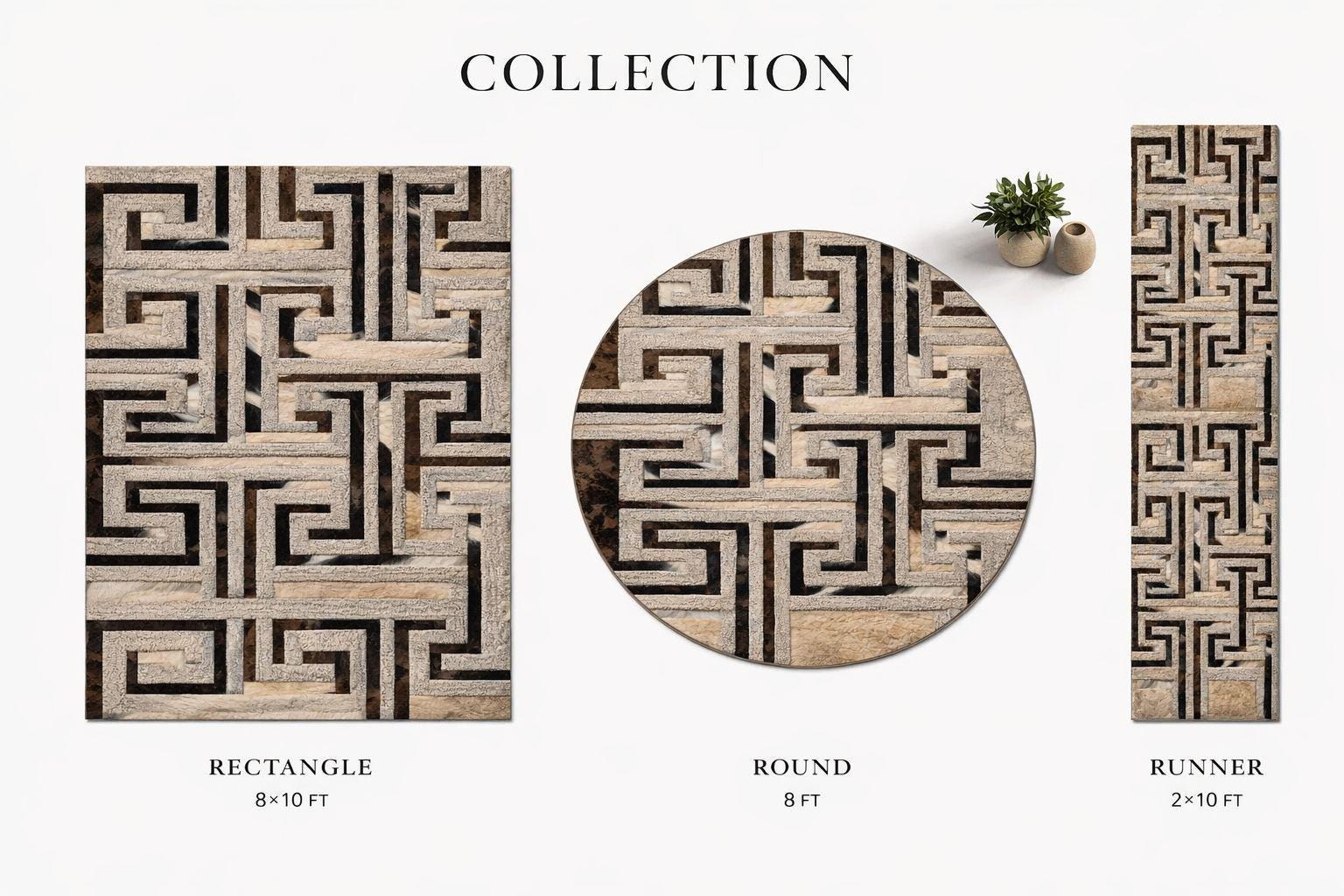 Elevate your space with this luxurious handmade rug crafted from premium natural leather and soft wool by Designer T.D. Designed with a bold geometric maze pattern, this piece blends texture, depth, and modern elegance into one striking statement.
