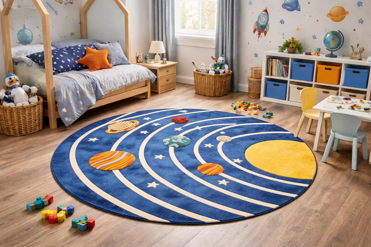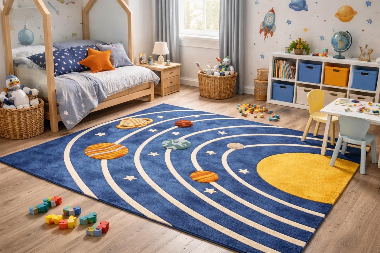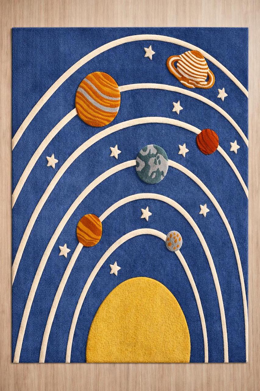 Turn your child’s room into a universe of imagination with this hand-tufted solar system rug Designed with vibrant planets, orbit lines, and a bold cosmic background, this rug is both playful and educational—perfect for curious little explorers.