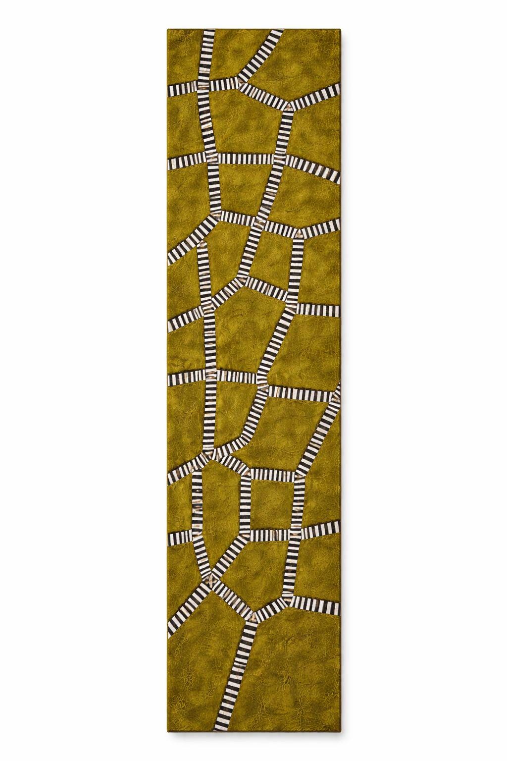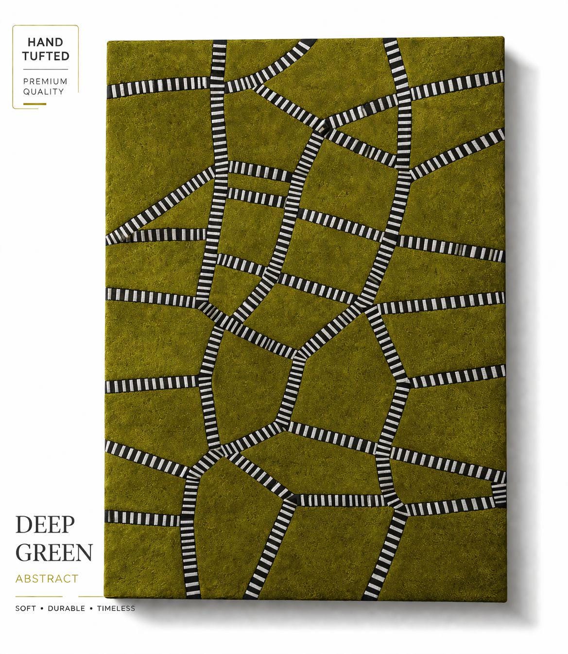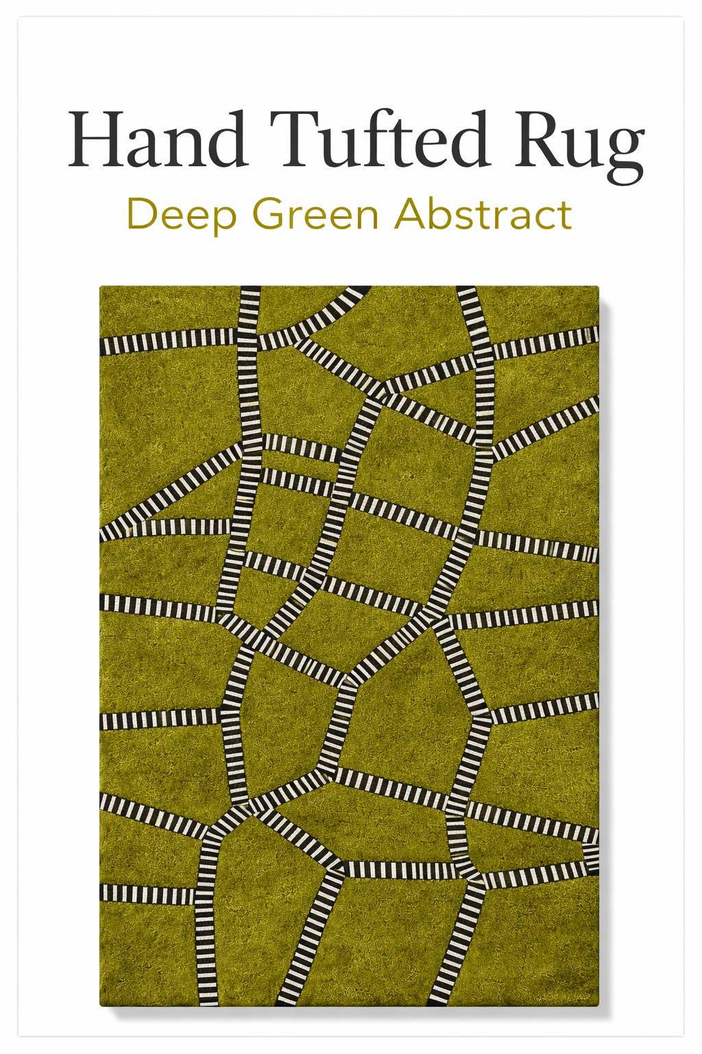 Make a bold statement with this hand-tufted abstract rug, designed to transform any space into a modern masterpiece. Featuring a rich deep green base intersected by striking black and ivory geometric lines, this rug blends organic texture with architectural design.