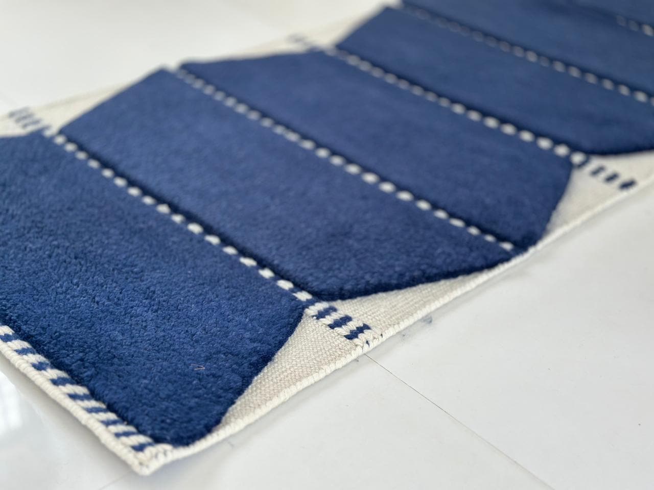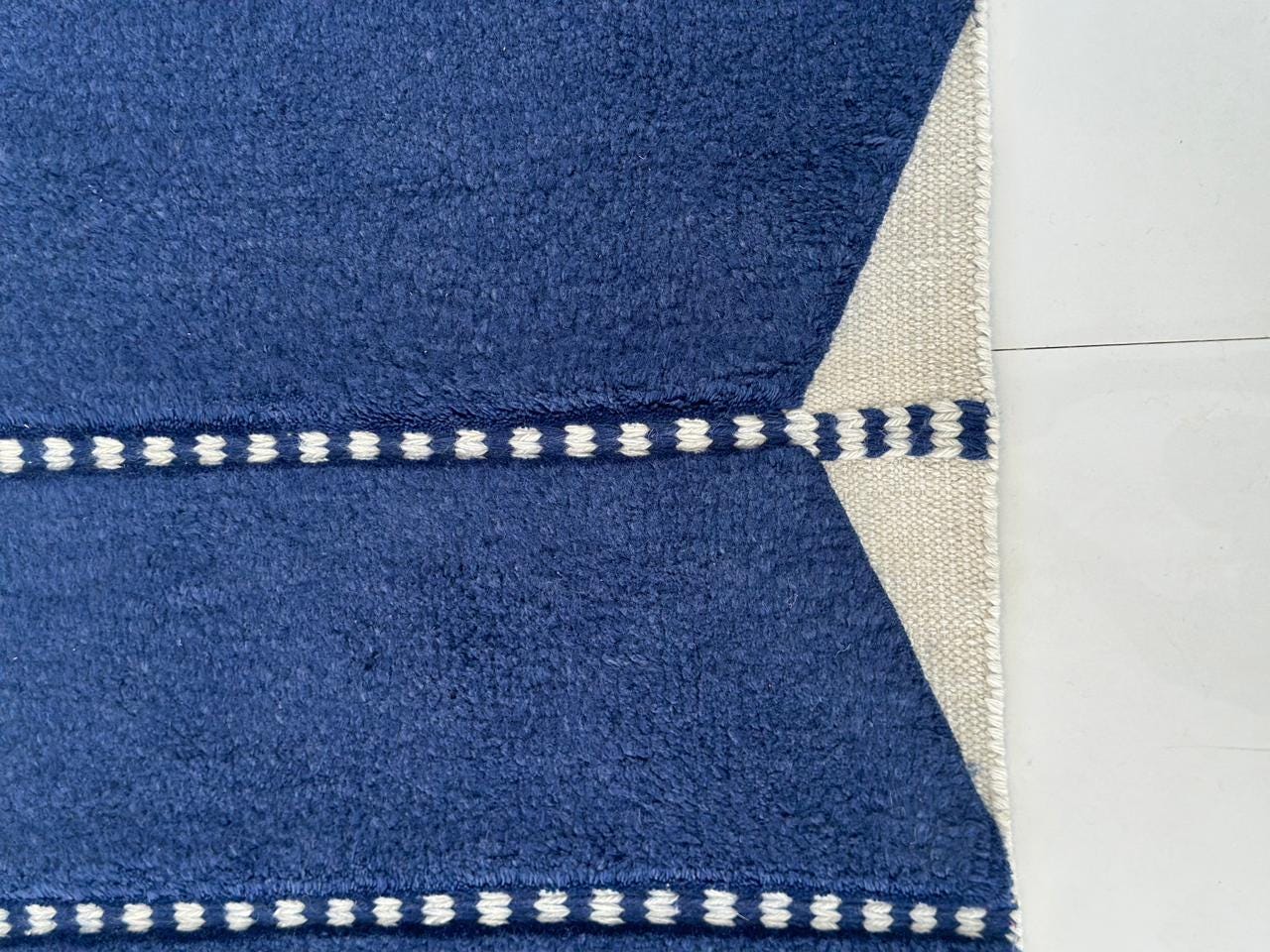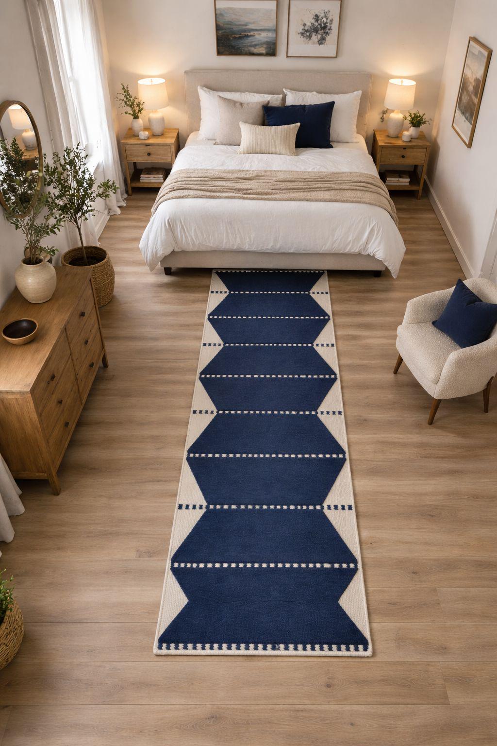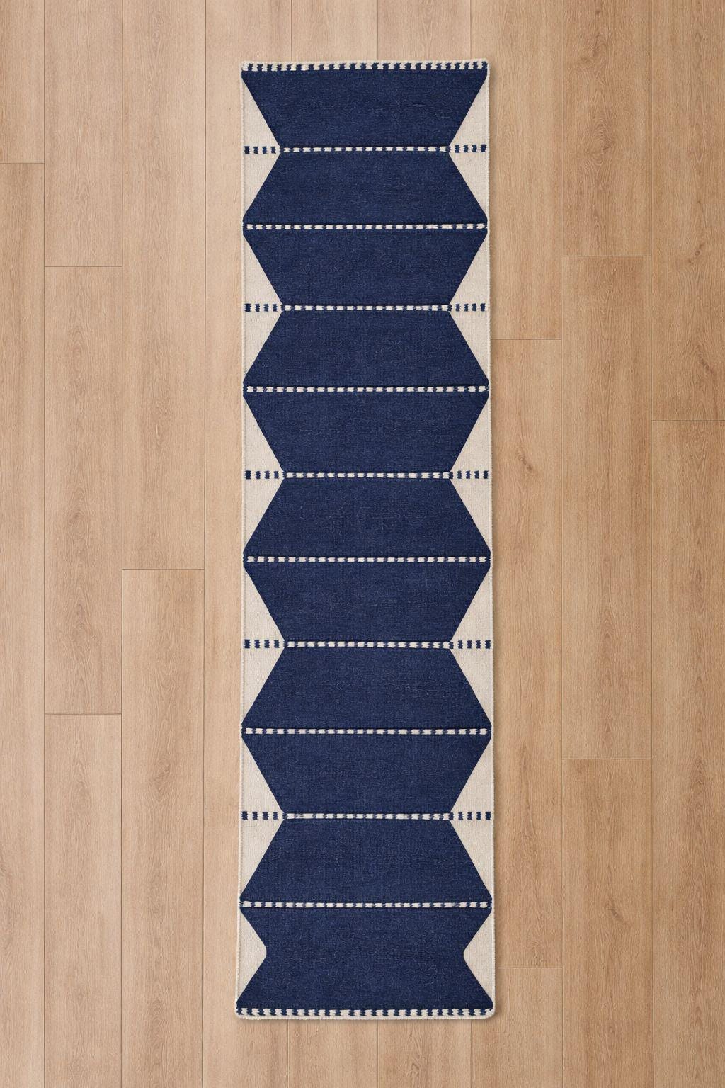 Bring timeless craftsmanship and bold simplicity into your home with this hand-knotted Moroccan runner rug. Designed in a deep indigo blue tone with soft ivory accents, this rug features a striking sequence of geometric forms inspired by traditional Berber tribal patterns.