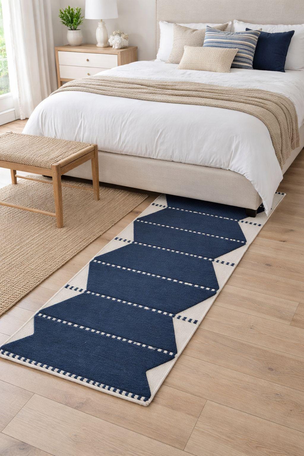 The design blends minimalism with heritage, where repeating geometric motifs create rhythm and balance—ideal for modern, bohemian, Scandinavian, or rustic interiors.