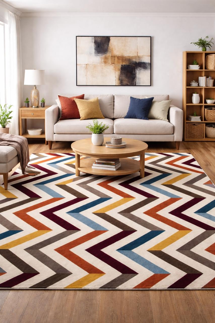 Add bold personality and modern artistry to your space with this hand-tufted loop pile rug, designed in a striking multicolor chevron (zigzag) pattern. Featuring a dynamic mix of warm and cool tones, this rug brings movement, depth, and a contemporary edge to any room.