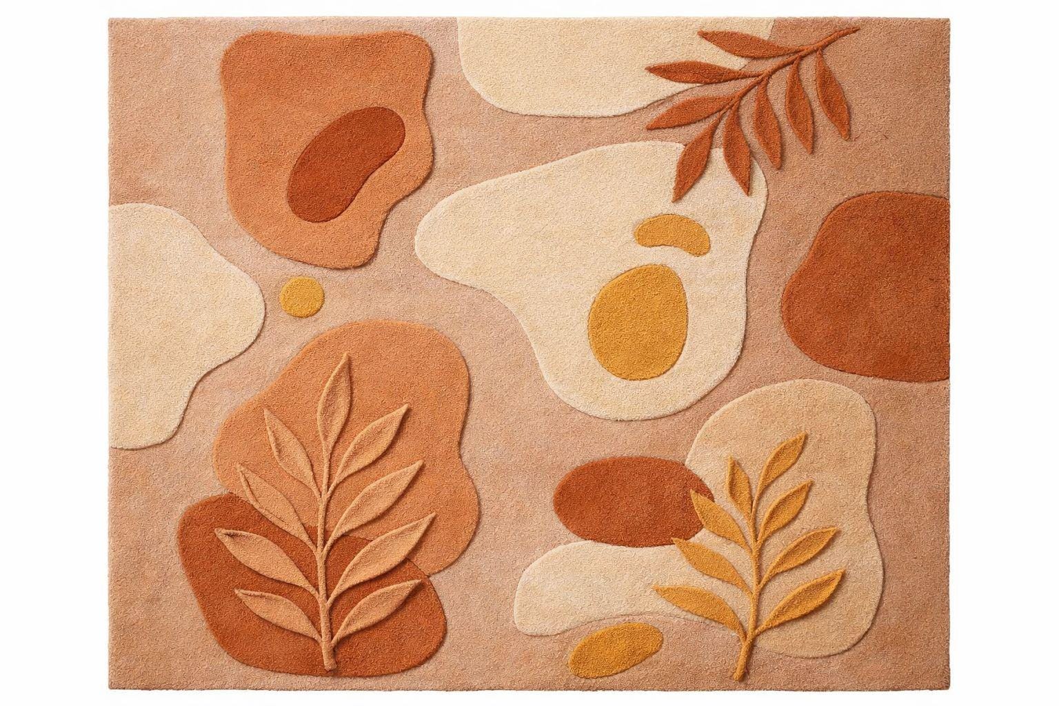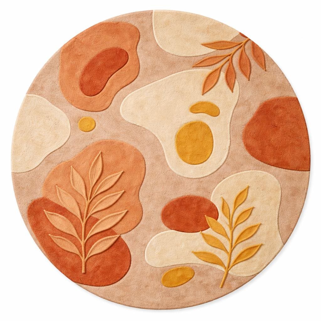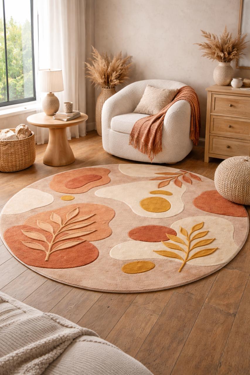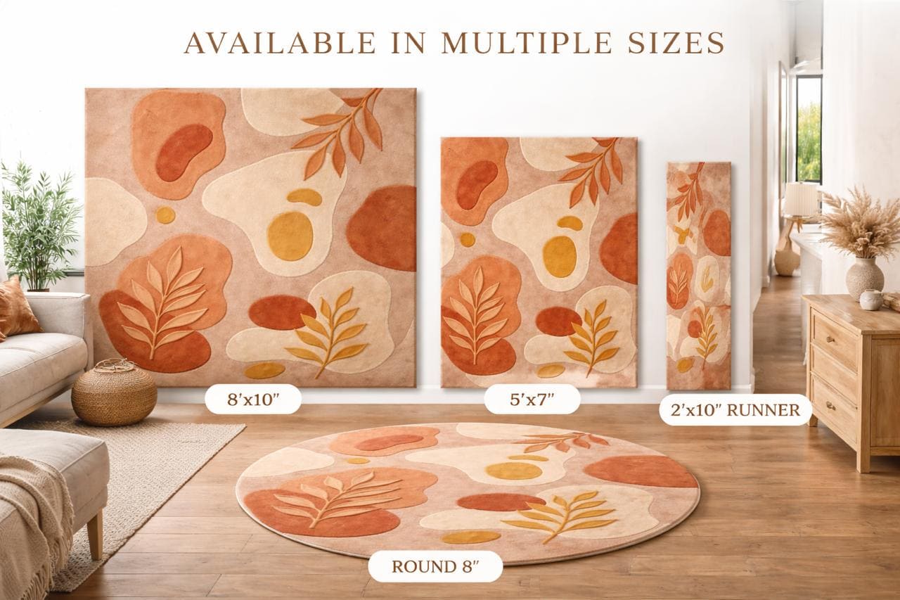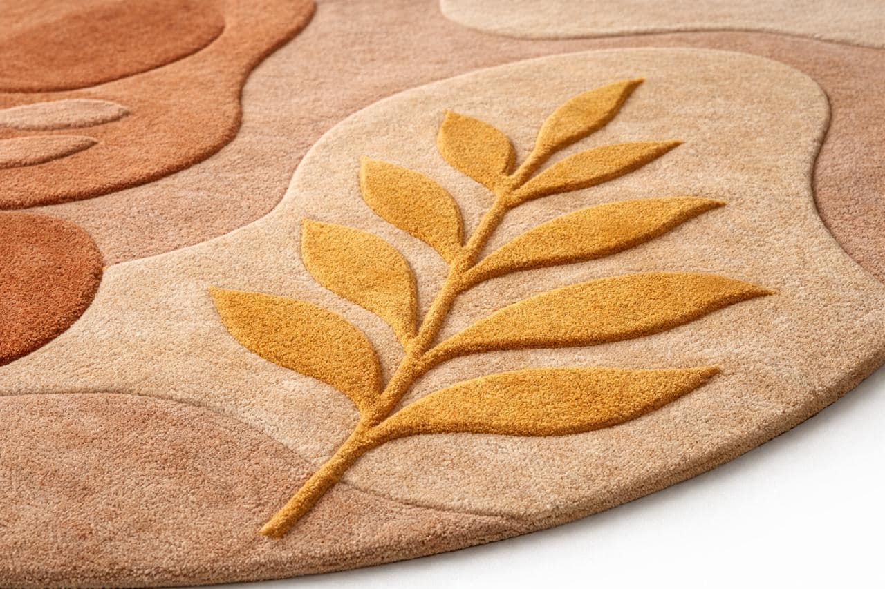 The harmonious palette of warm terracotta, soft beige, creamy ivory, and muted ochre reflects nature’s earthy elegance—perfectly aligned with today’s high-end interior trends. Each form is thoughtfully layered and hand-carved, creating a subtle high-low texture that adds depth, dimension, and a tactile richness underfoot.