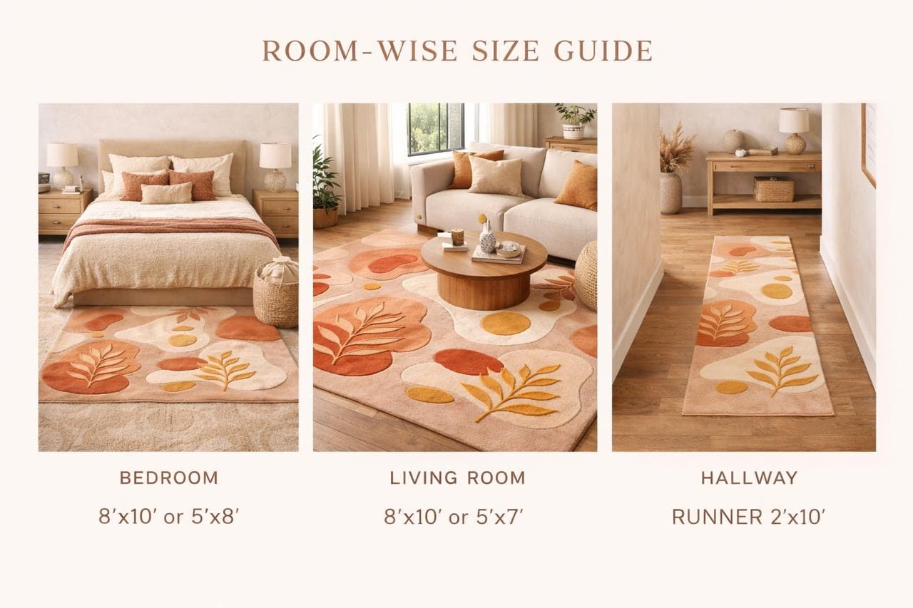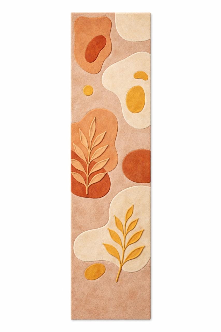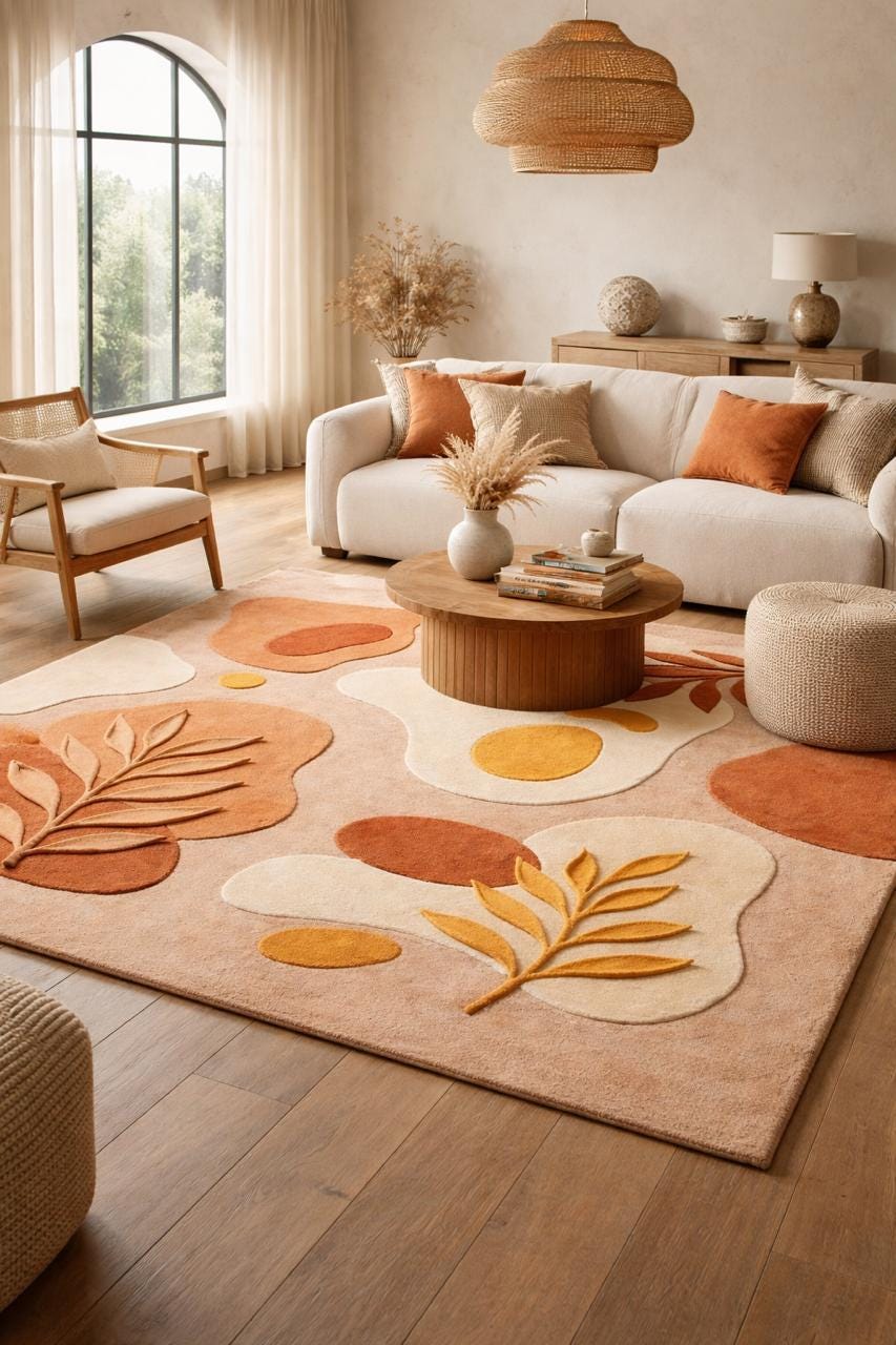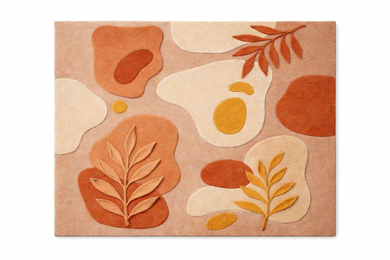 The harmonious palette of warm terracotta, soft beige, creamy ivory, and muted ochre reflects nature’s earthy elegance—perfectly aligned with today’s high-end interior trends. Each form is thoughtfully layered and hand-carved, creating a subtle high-low texture that adds depth, dimension, and a tactile richness underfoot.