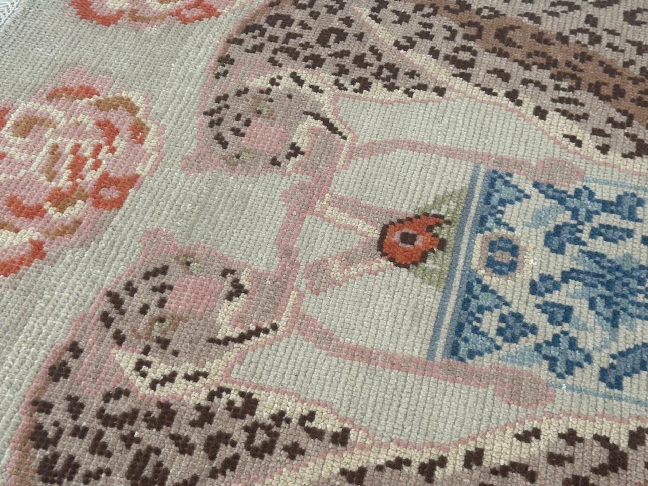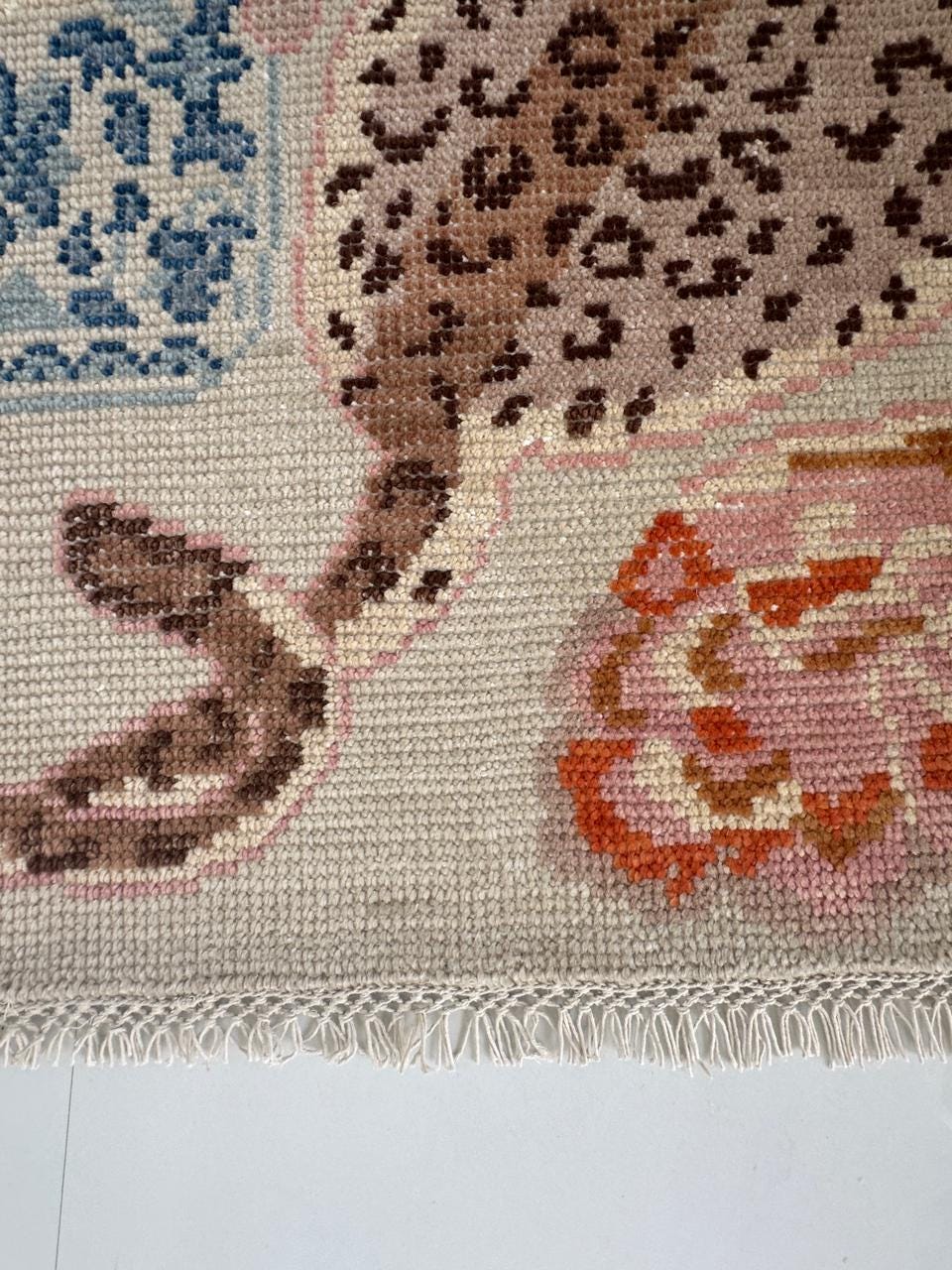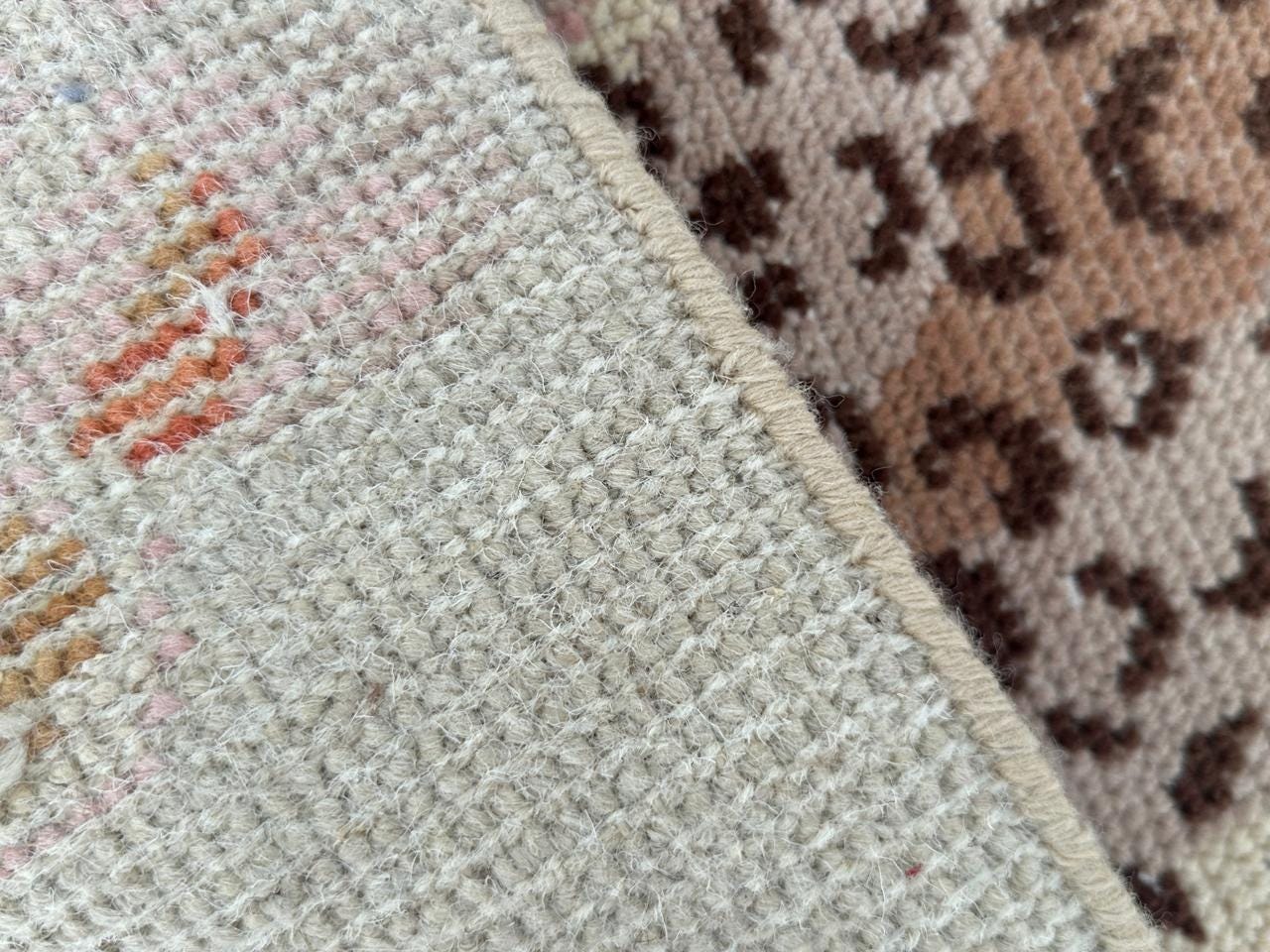 Each rug is meticulously hand-knotted, making it a one-of-a-kind statement piece. The soft neutral base combined with warm tones of pink, brown, and blue creates a balanced aesthetic that fits beautifully in modern, eclectic, or cottagecore interiors.