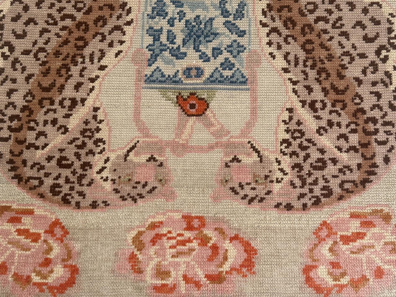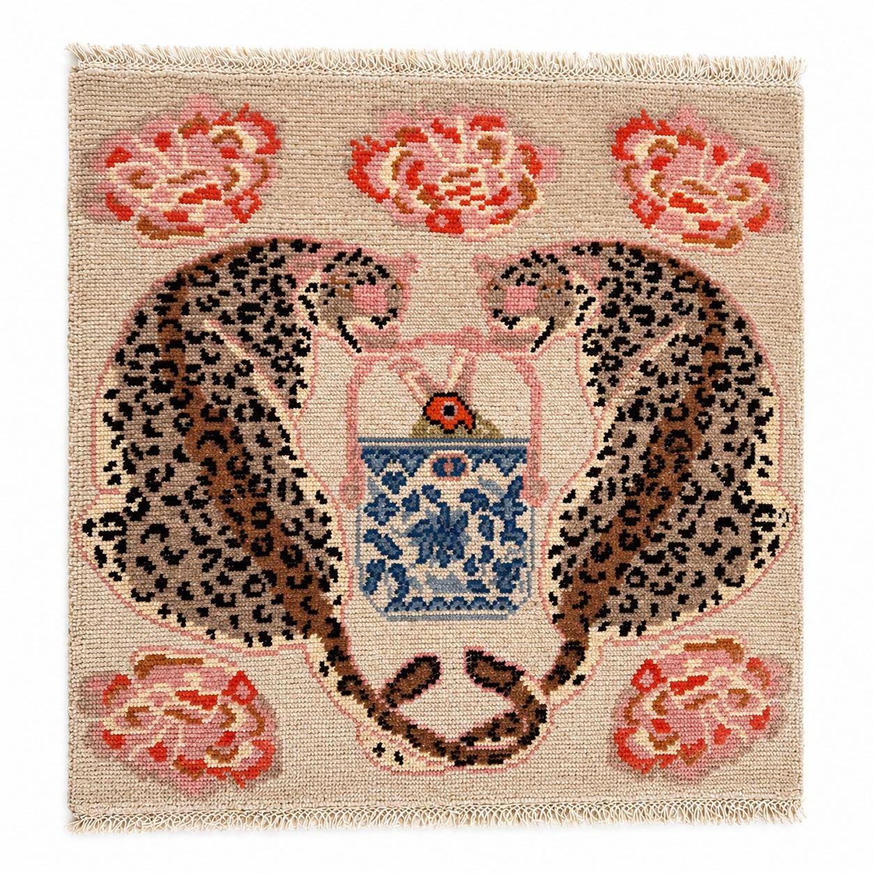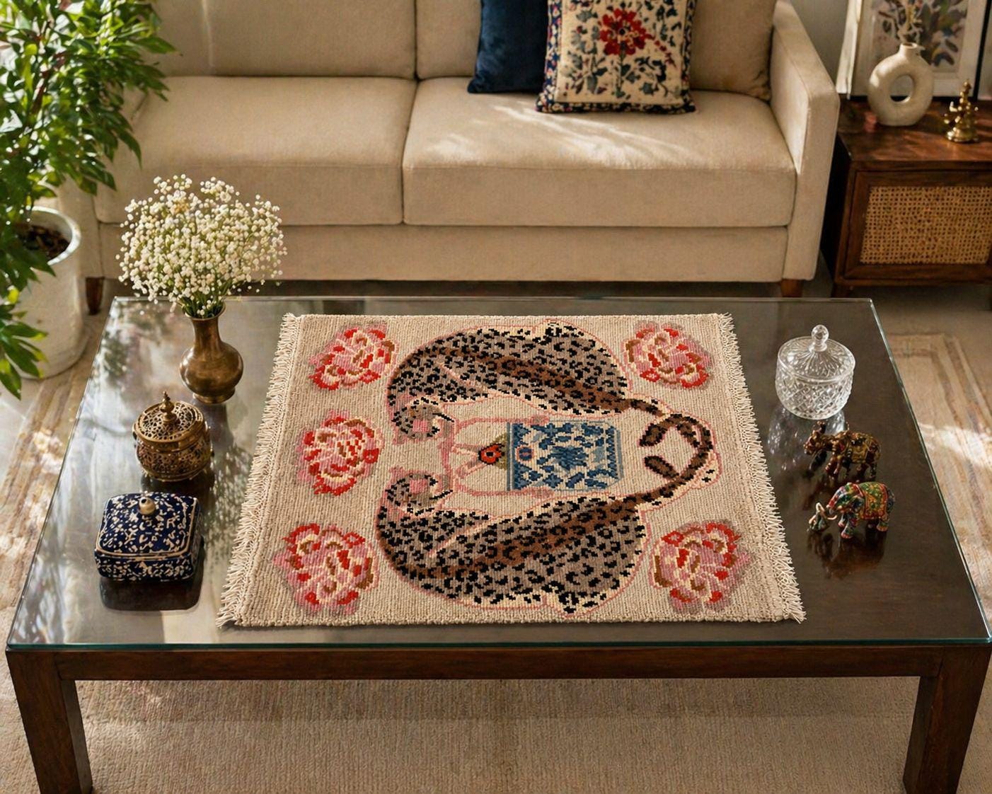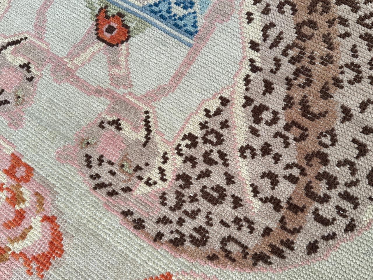 Add a playful yet elegant touch to your space with this hand-knotted leopard tea rug. Featuring a whimsical design of a spotted leopard curled around a decorative teacup, surrounded by soft floral accents, this piece blends artistic charm with cozy craftsmanship.
