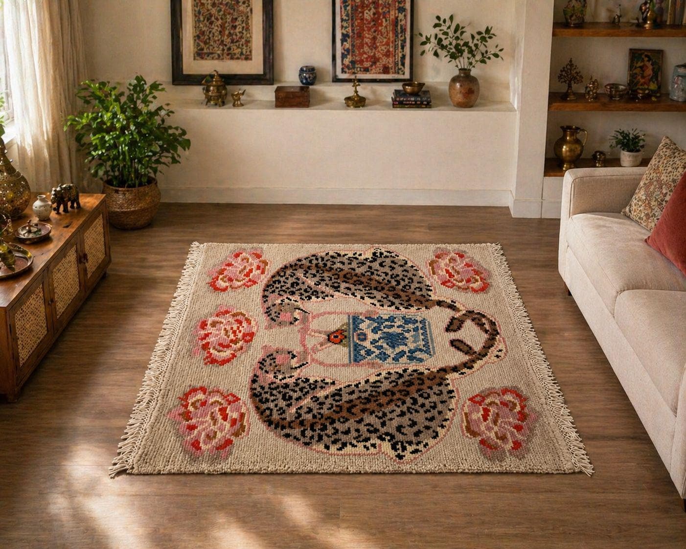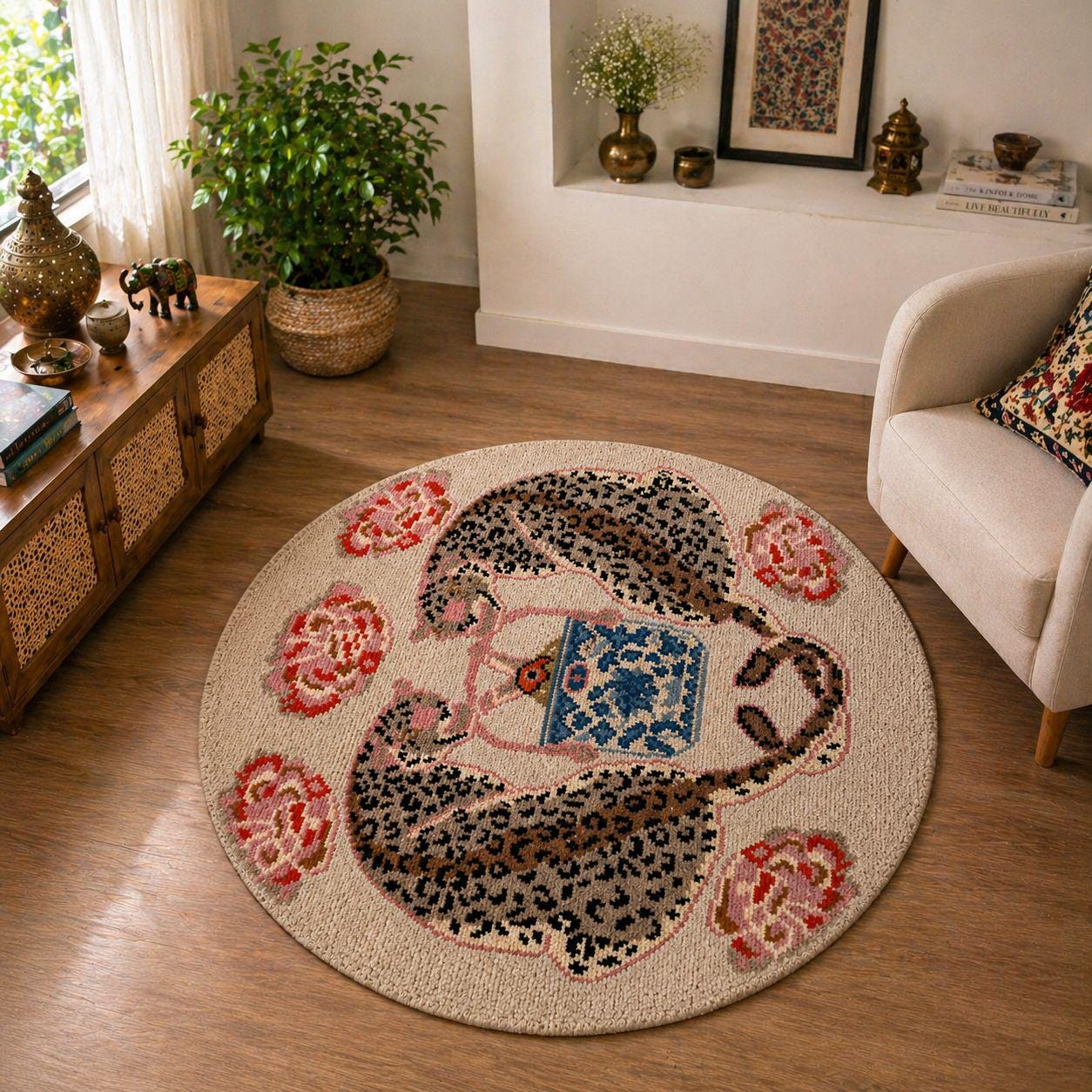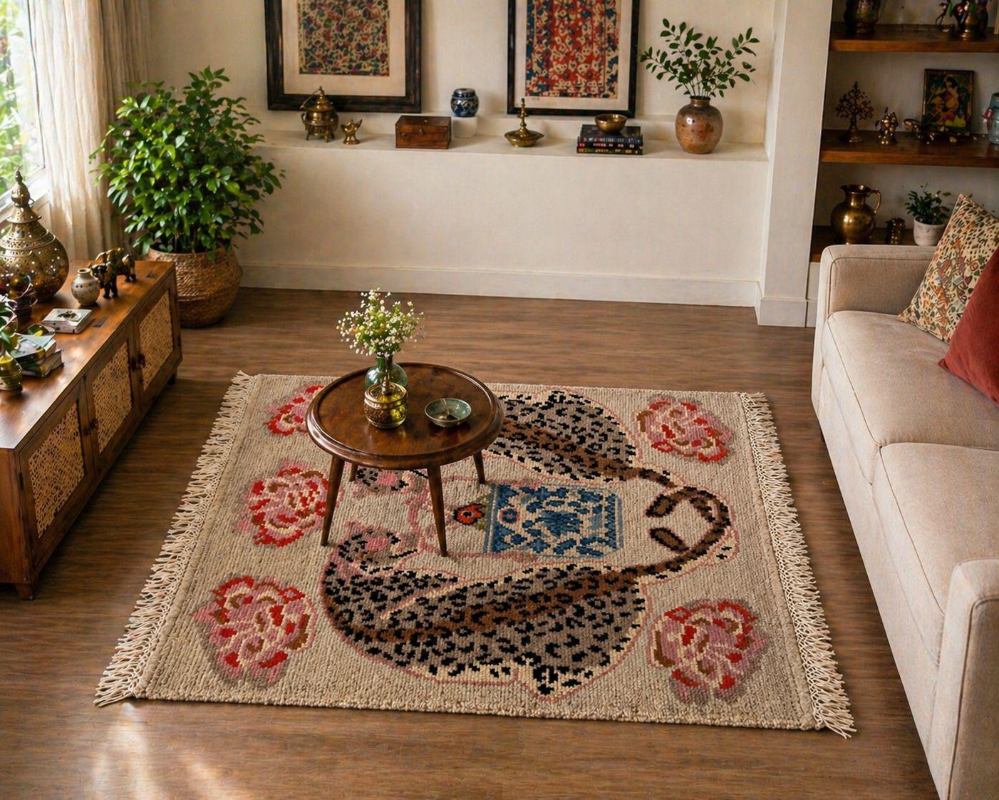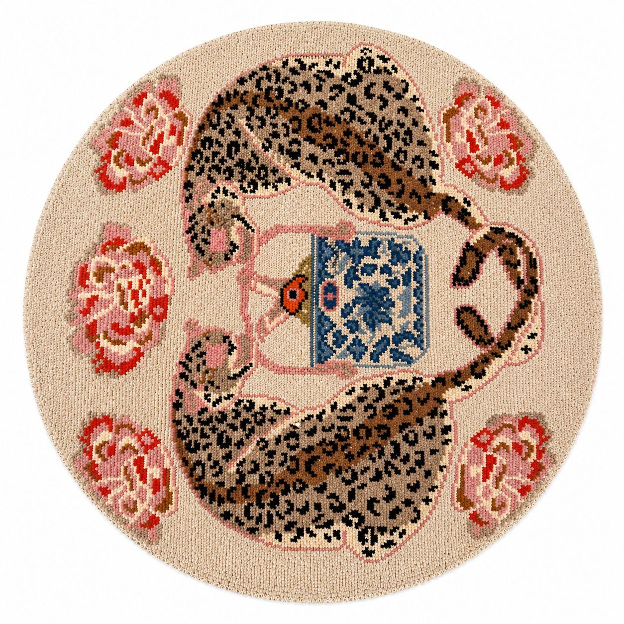 Add a playful yet elegant touch to your space with this hand-knotted leopard tea rug. Featuring a whimsical design of a spotted leopard curled around a decorative teacup, surrounded by soft floral accents, this piece blends artistic charm with cozy craftsmanship.